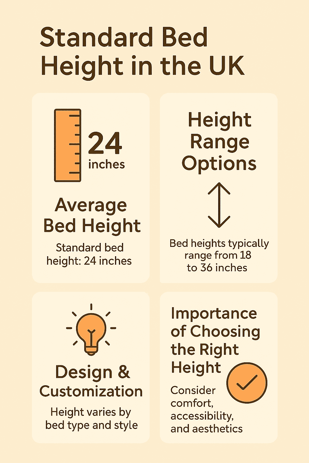 The standard height of a bed in the UK is 24 inches (60 cm) from the floor to the top of the mattress. This measurement includes the bed frame, foundation such as a box spring or divan base, and the mattress itself.