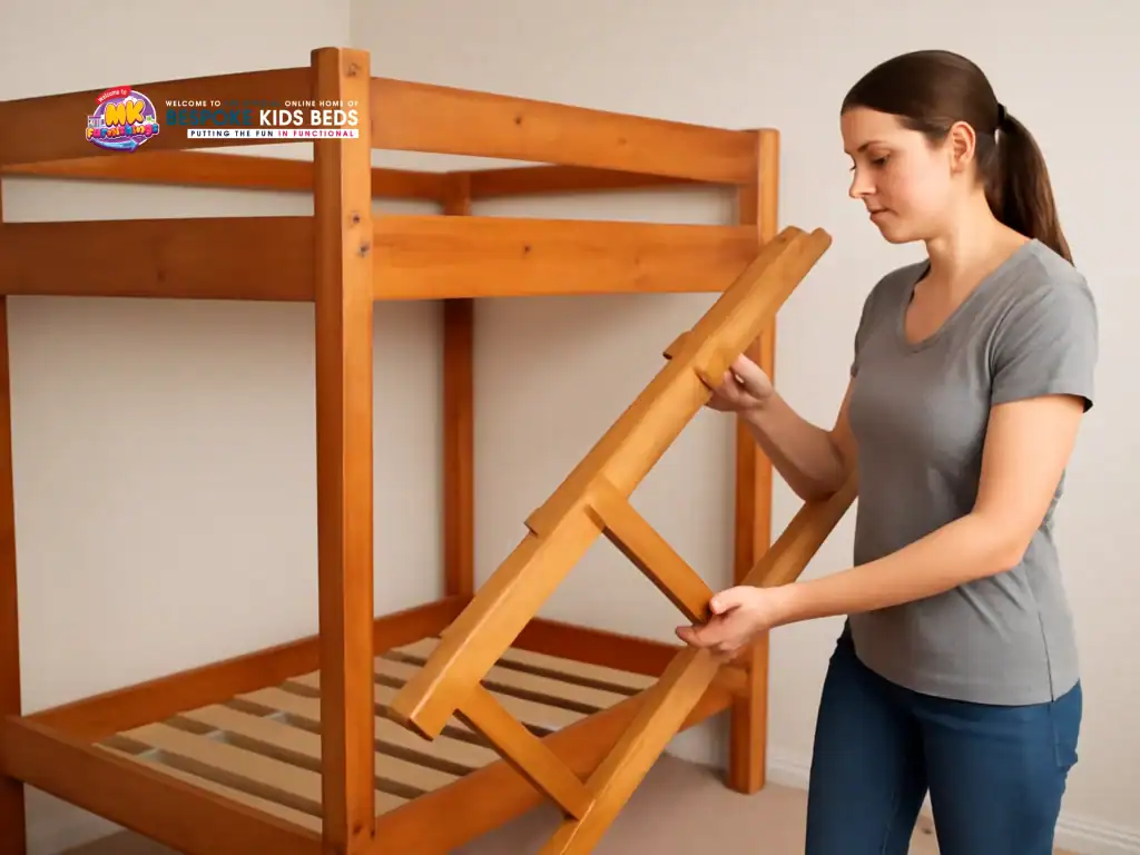 The ladder is typically fastened with bolts or screws, which should be loosened evenly on both sides. Hold the ladder steady while removing the last few fasteners to prevent it from tilting. If it is an integrated ladder, ensure the surrounding joints are released before pulling it away from the bed frame. Place the ladder on a soft surface to prevent scratches, and store all fasteners together. Detaching it early opens up space and makes it easier to separate the upper bunk safely.