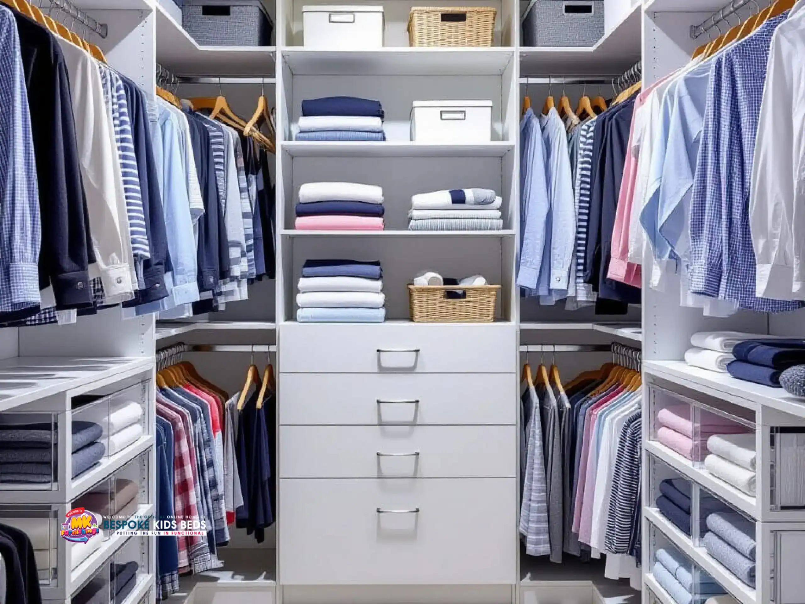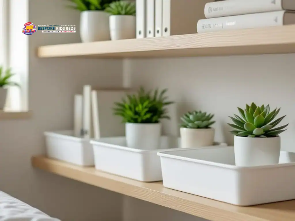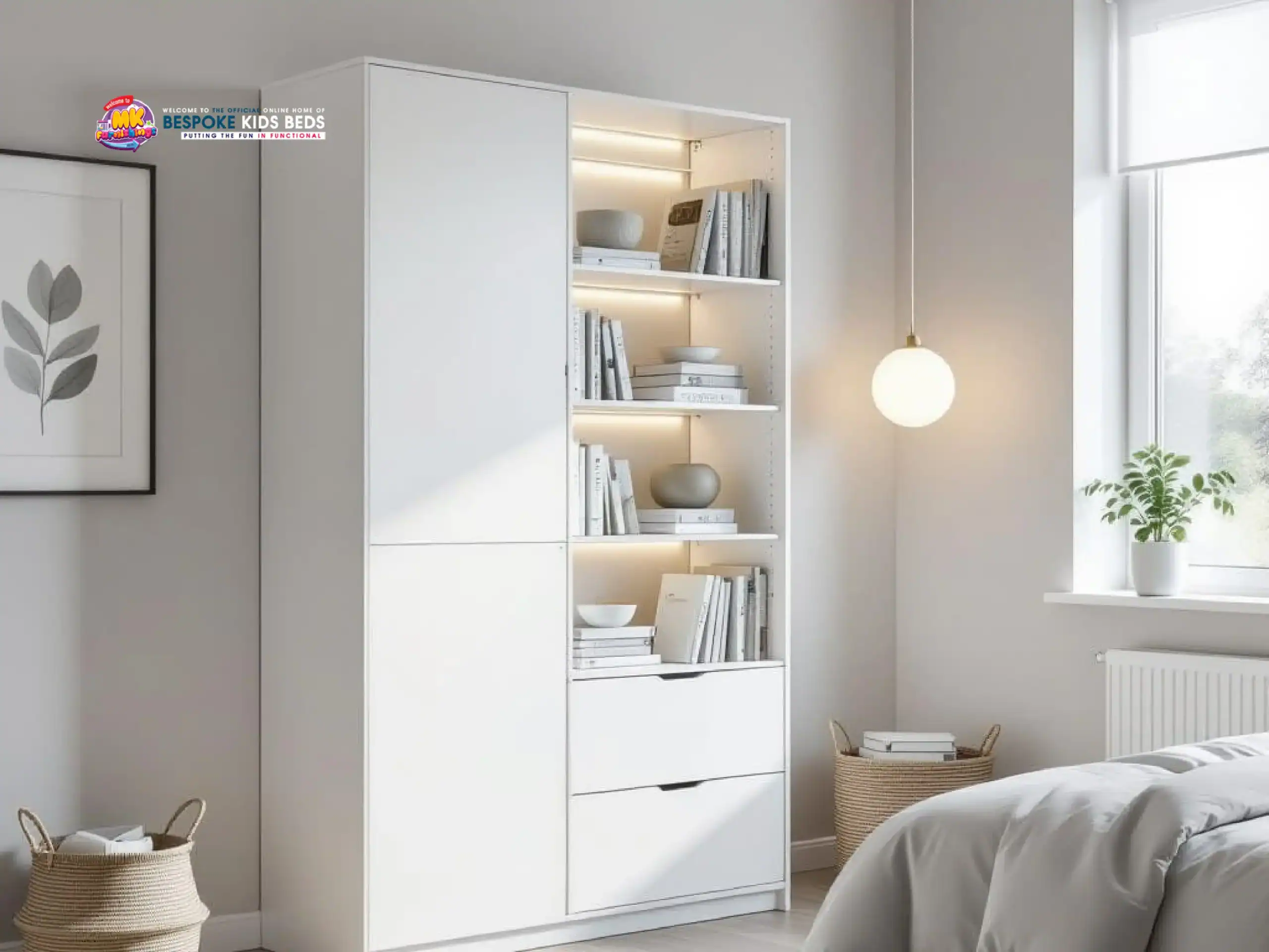 To maximise storage space in a small bedroom, focus on utilising vertical space with shelves or tall cabinets, and opt for multifunctional furniture like bunk beds with built-in storage or fold-out desks. Additionally, utilise underutilised spaces, such as the area beneath the bed, corners, and narrow gaps, by installing sliding storage bins or compact shelving units. Other space-saving solutions include over-the-door organisers, wall-mounted hooks, and hanging baskets that keep the room organised without taking up valuable floor space.