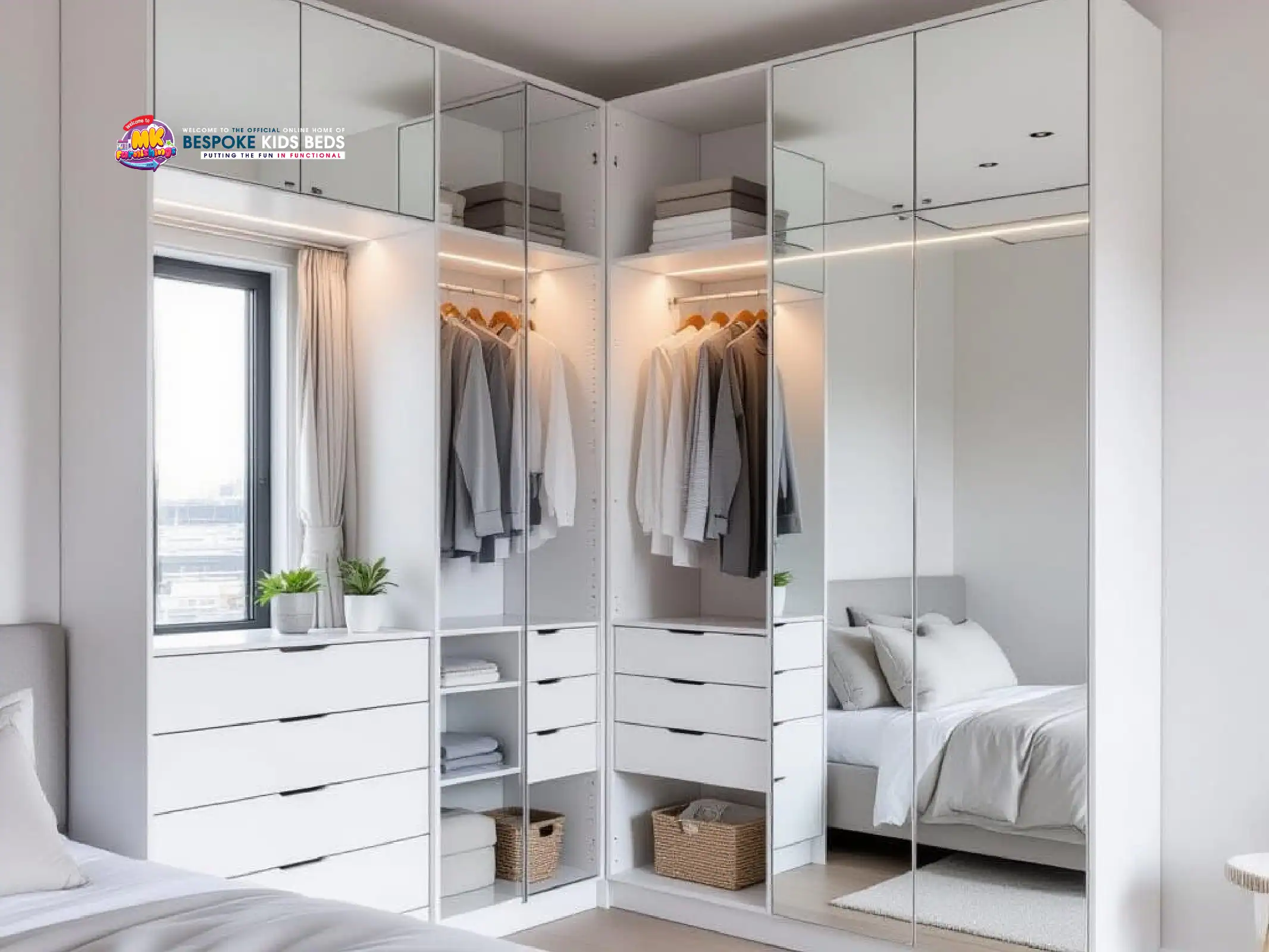 In small bedroom designs, awkward spaces like corners often go underutilised, but they can be transformed into highly efficient storage areas. Corner storage solutions, such as custom shelving or corner units, make use of these overlooked spots, providing ample storage without wasting valuable floor space. Adding pull-out drawers or hanging rails to these units allows you to organise clothing, books, or accessories with ease. For a modern touch, a corner unit with mirrored surfaces can help reflect light, brightening the room and making it feel larger. By incorporating corner storage, you optimise every inch of your bedroom while maintaining a clean, clutter-free aesthetic.