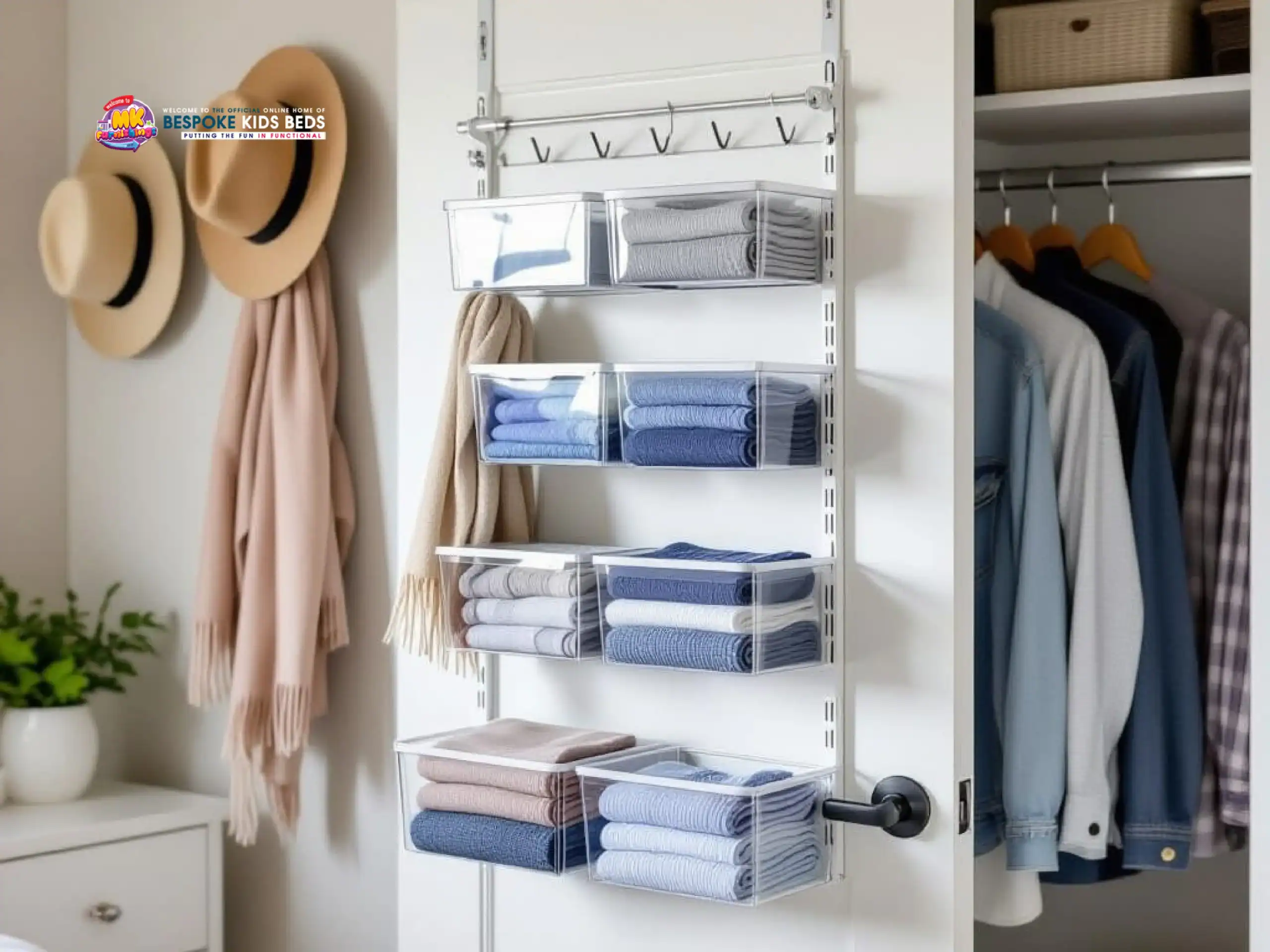In small bedrooms with limited space, every inch matters. One often-overlooked awkward space is the back of closet doors, which can be utilised for practical storage. By installing an over-the-door organiser, you can efficiently store items like frequently used accessories, hats, or scarves. You can even add a small pole for hanging outfits, allowing you to easily plan your wardrobe for the next day. With narrow hooks and clear plastic holders, all your essentials remain accessible and organised, making the most of otherwise wasted space while keeping everything within reach.