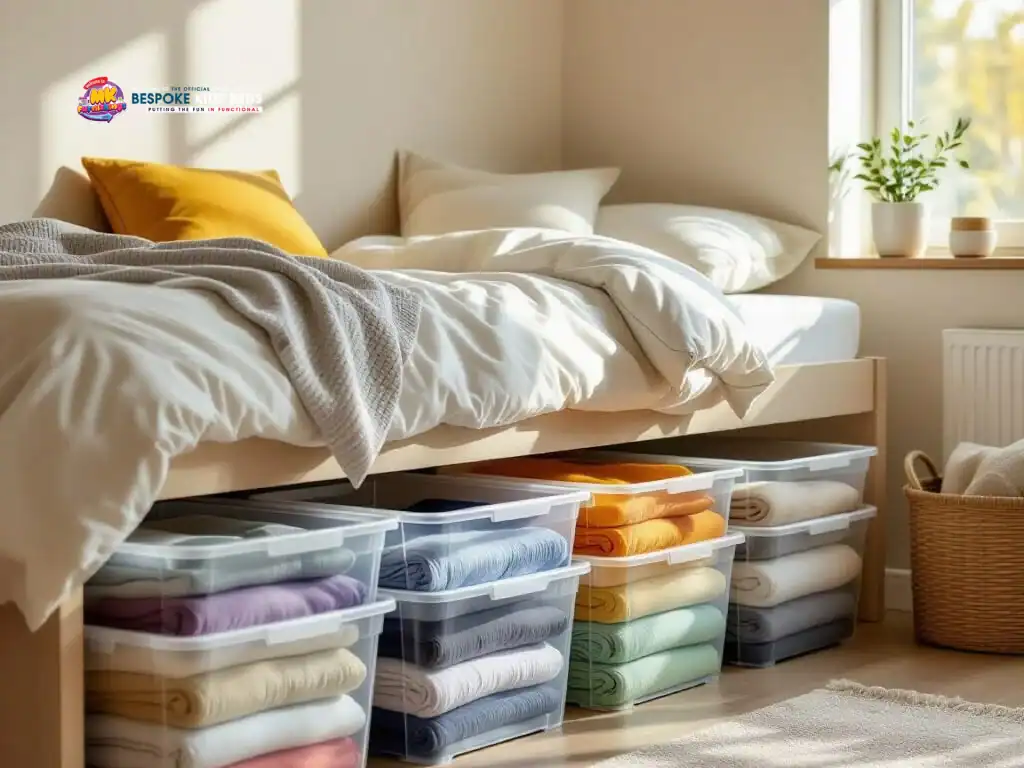 Under-bed storage bins are a simple yet highly effective way to store items in a small bedroom. These bins are perfect for organising off-season clothes, extra bedding, or personal items that you do not need daily. Clear bins make it easy to identify contents, while colour-coded bins provide quick and easy organisation. Under-bed storage bins help you keep your space tidy while making the most of otherwise unused space beneath the bed.