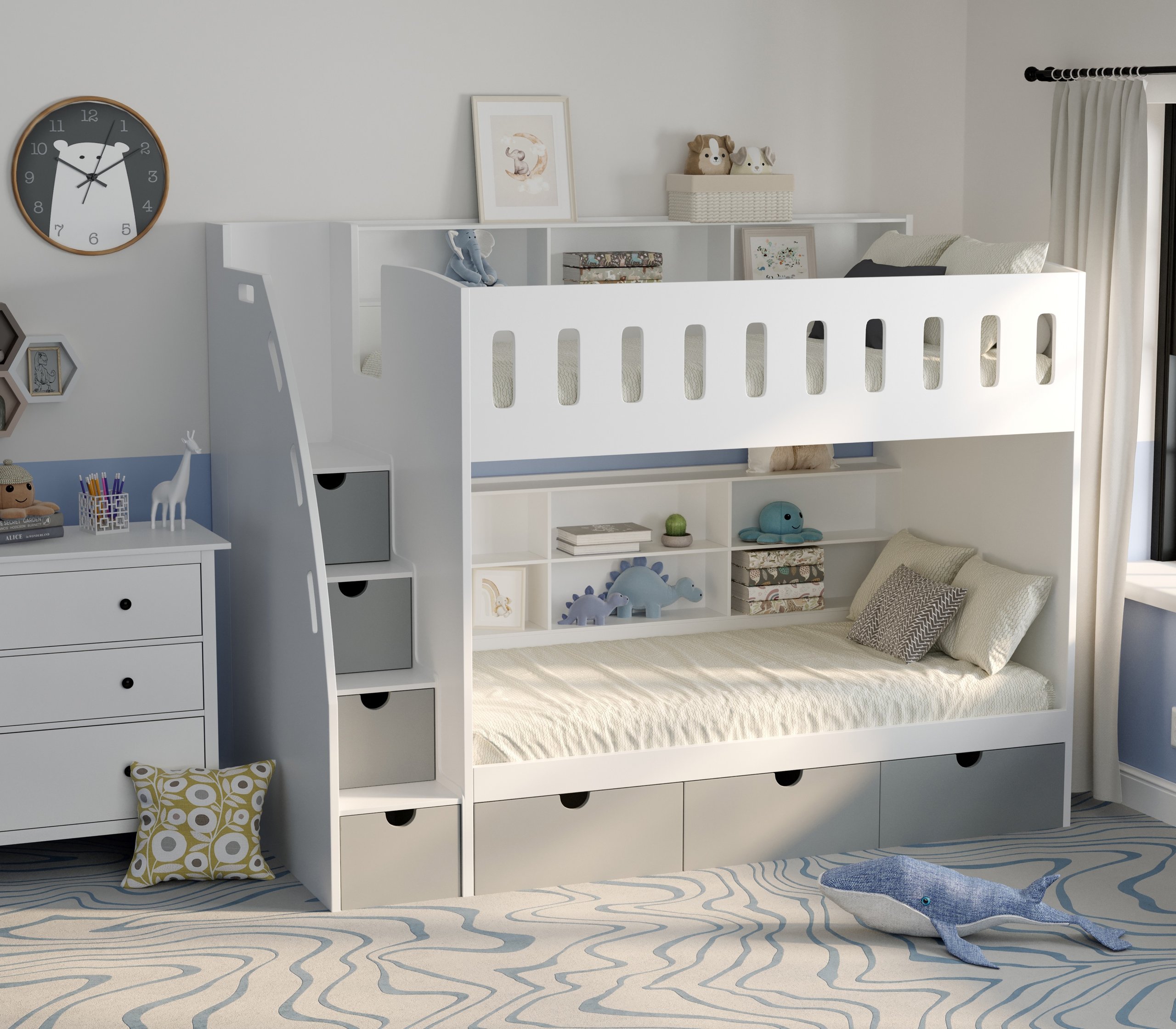 Built for comfort and practicality, the bunk bed with shelves sleeps two children on single-over-single beds. It includes a four-step staircase with deep drawers built into each step, offering even more concealed storage. The bottom bunk features 3 underbed drawers.