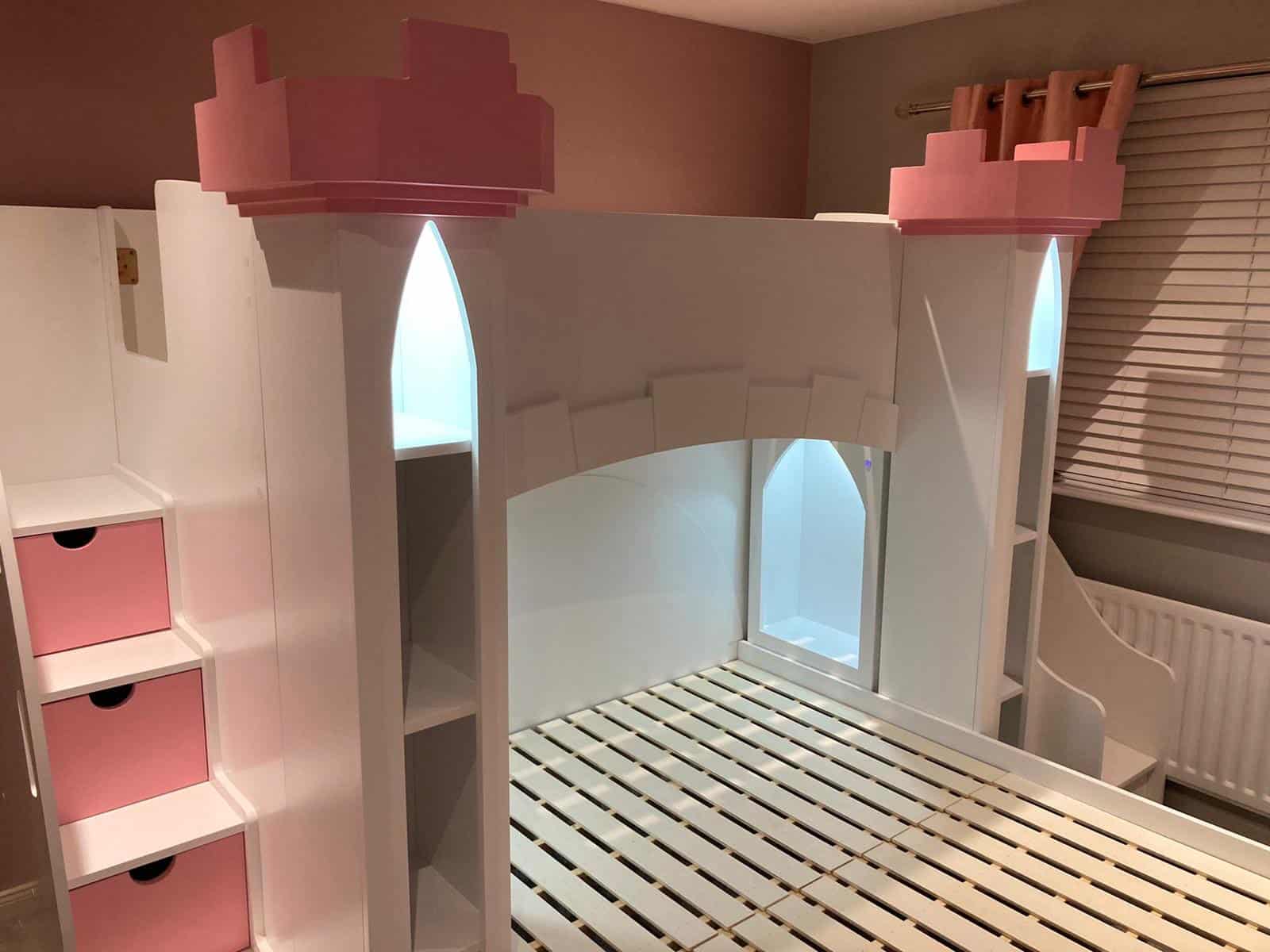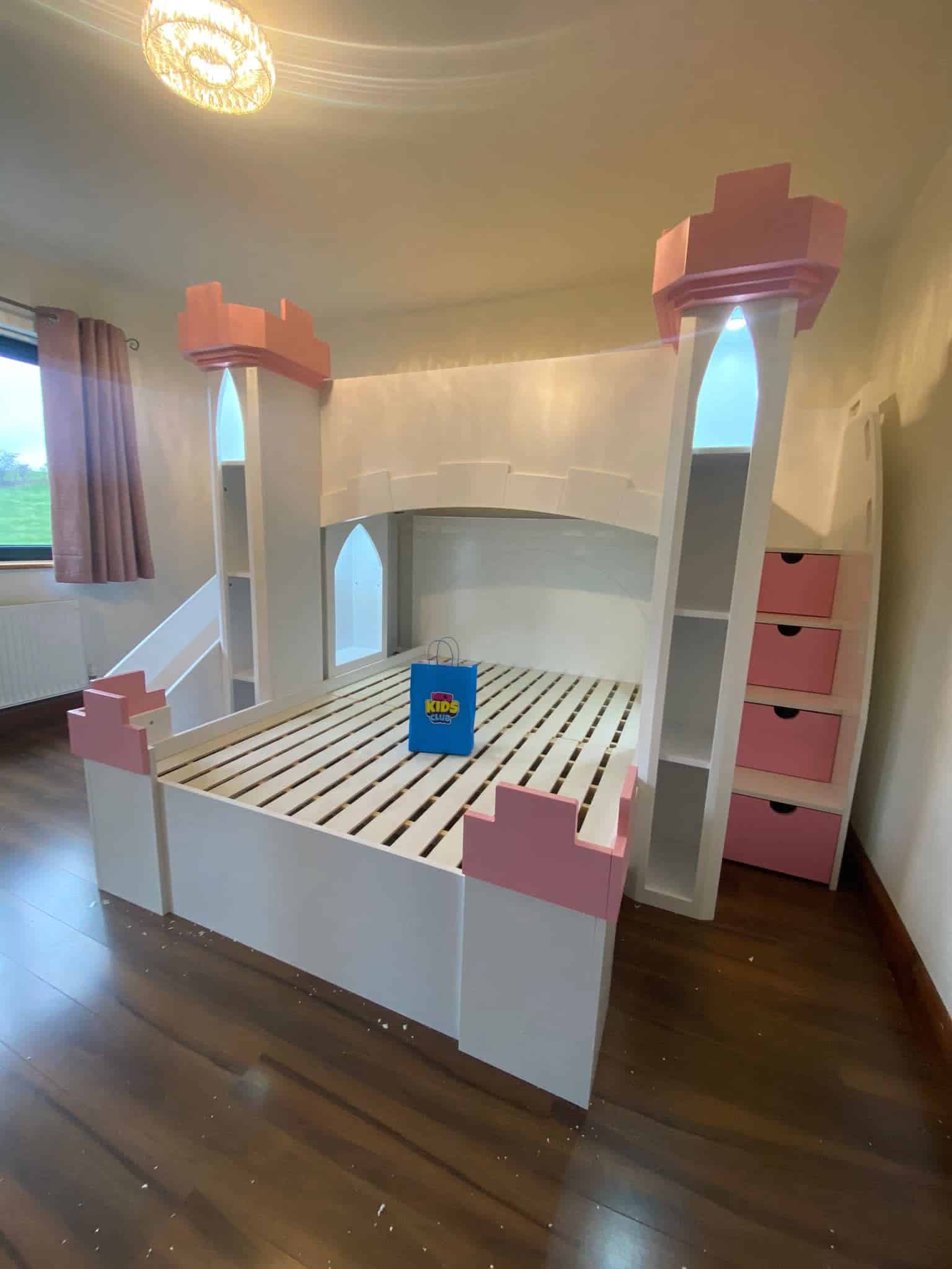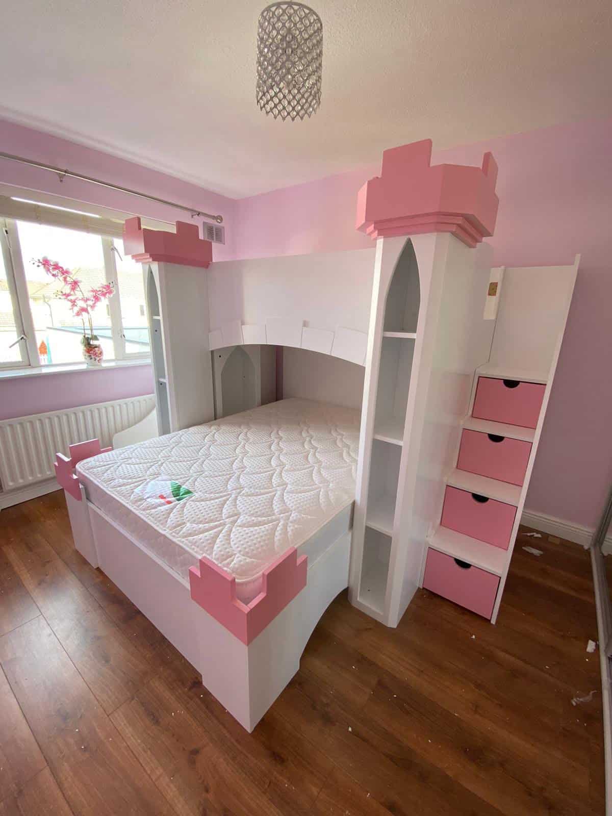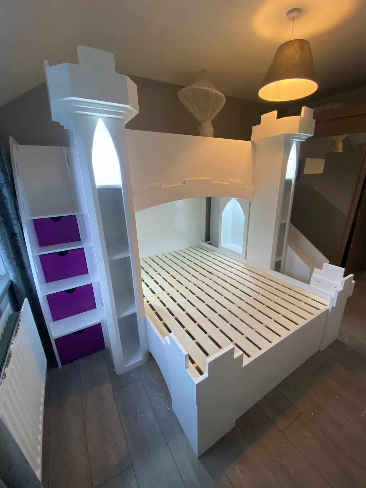 The Castle Bunk Bed is designed with practical storage options including staircase drawers and shelves, perfect for keeping your child’s room tidy and organised. The innovative stairs provide easy and safe access to the top bunk, enhancing the functionality of this charming furniture piece.