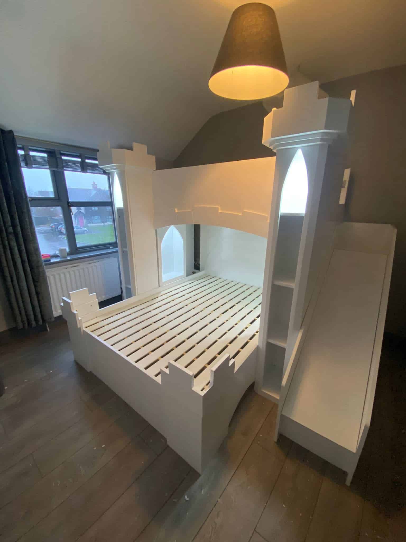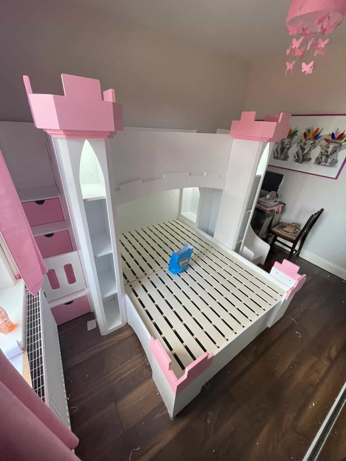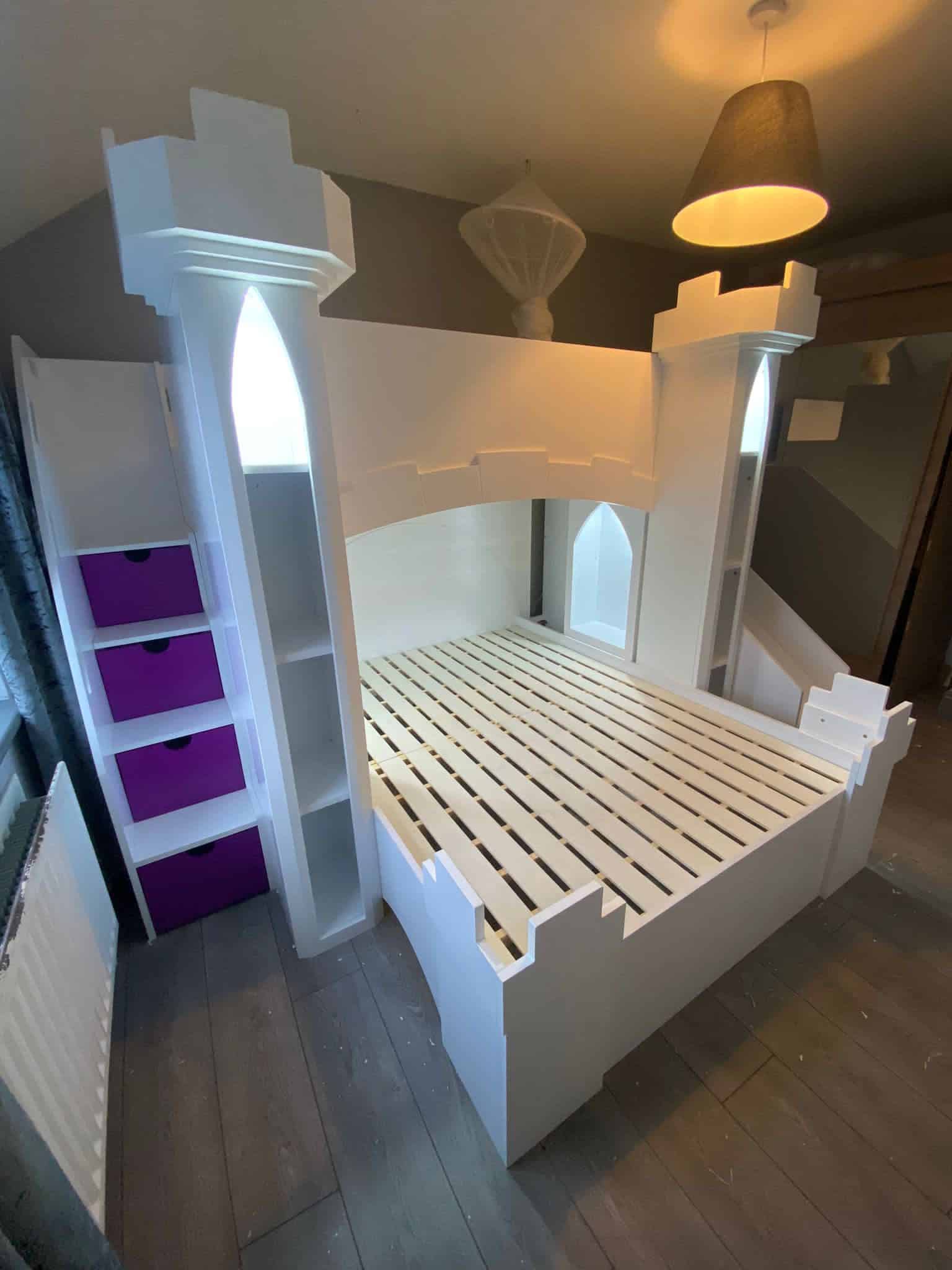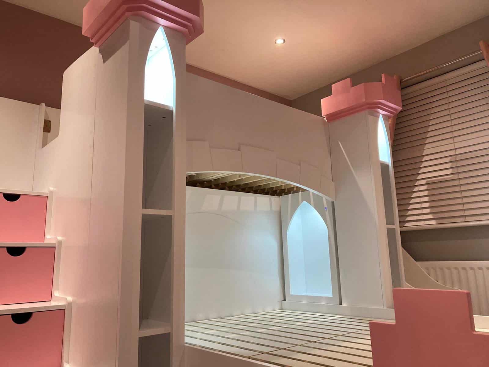 The Castle Bunk Bed is designed with practical storage options including staircase drawers and shelves, perfect for keeping your child’s room tidy and organised. The innovative stairs provide easy and safe access to the top bunk, enhancing the functionality of this charming furniture piece.