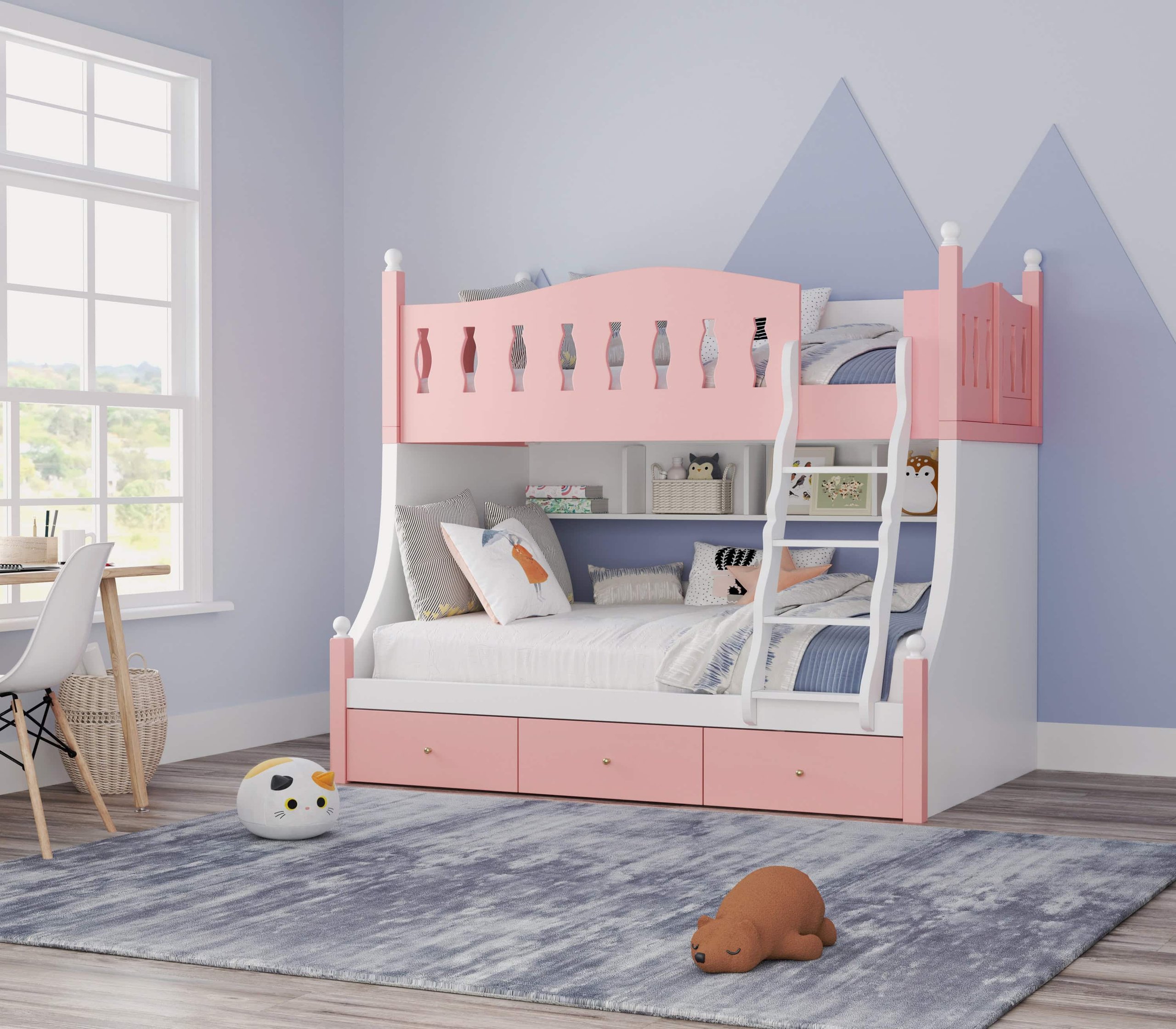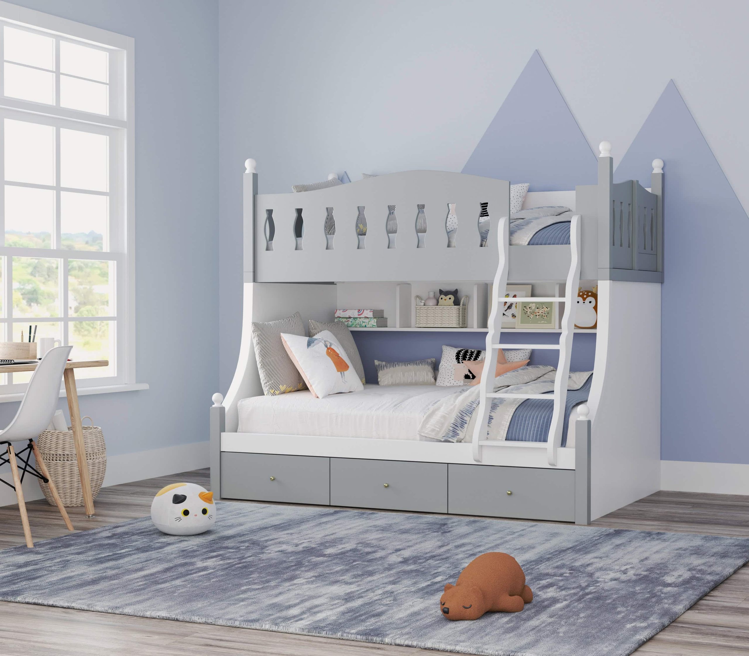 Safety is our priority; the bed comes with sturdy guardrails and complies with European Standard EN747-1 and EN747-2 of 2012, ensuring a safe sleeping environment. The ladder is securely attached, providing safe and easy access to the top bunk.
