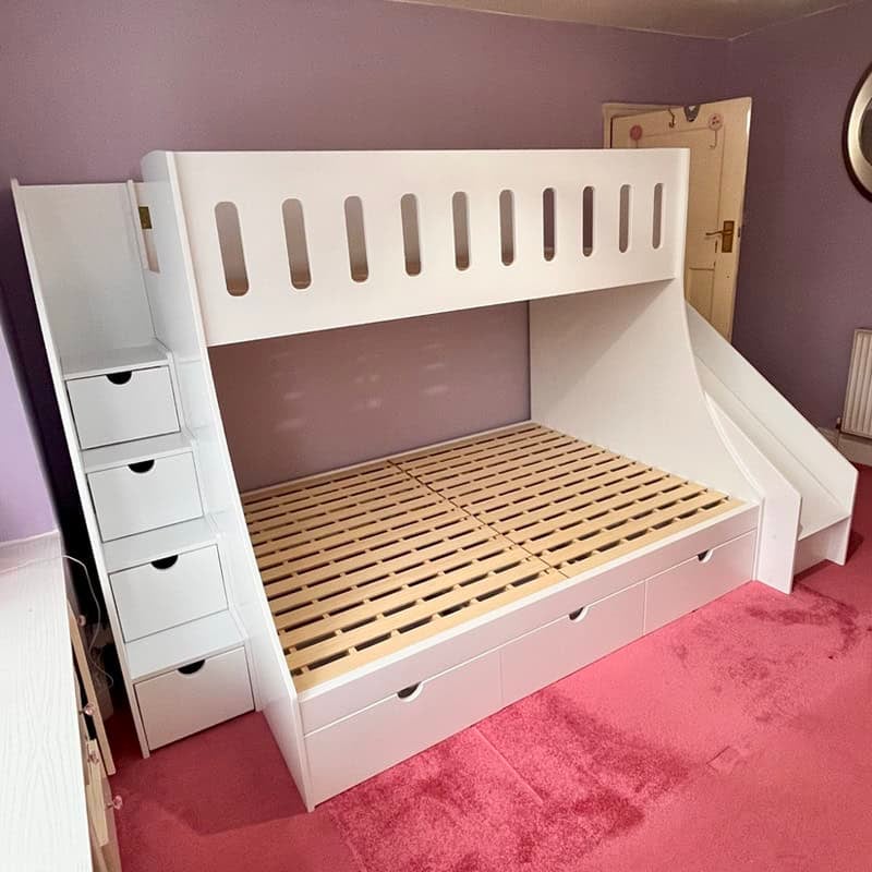 The bunk bed features versatile storage options including under-bed storage, staircase storage, and a long shelf, making it easy to keep the room tidy and organised. The stairs not only save space but are equipped with anti-slip surfaces and can be enhanced with a stairgate for additional safety.