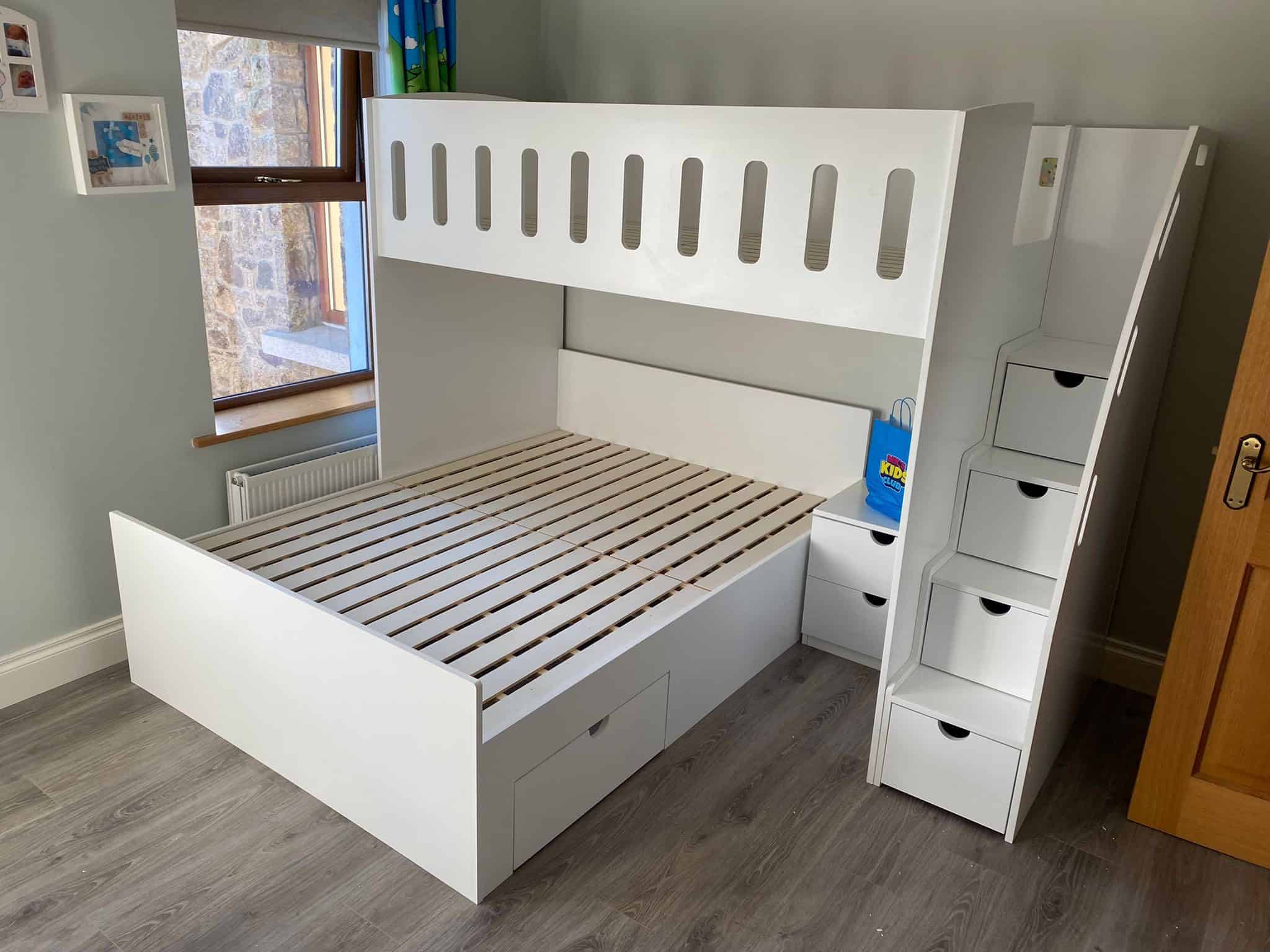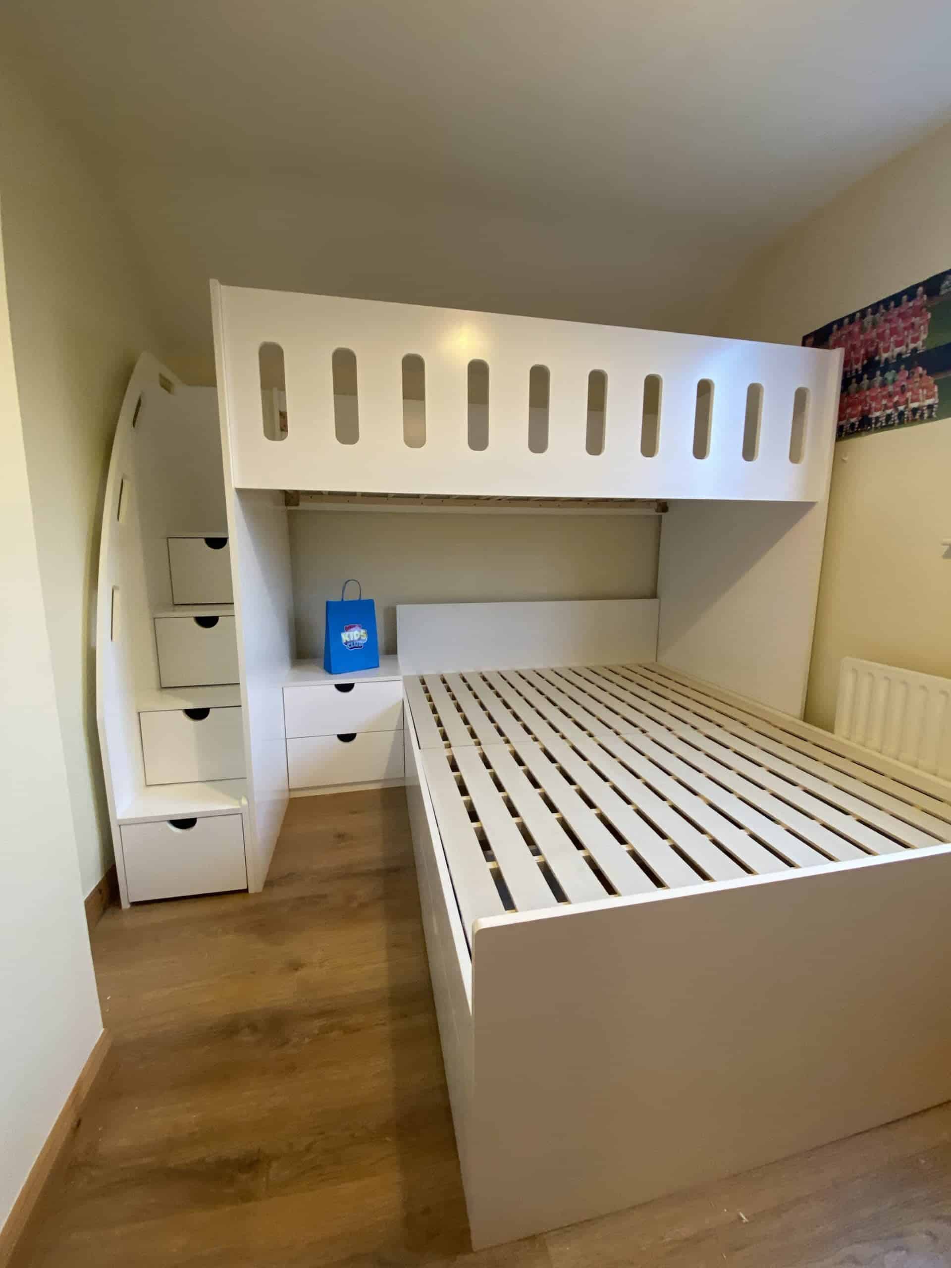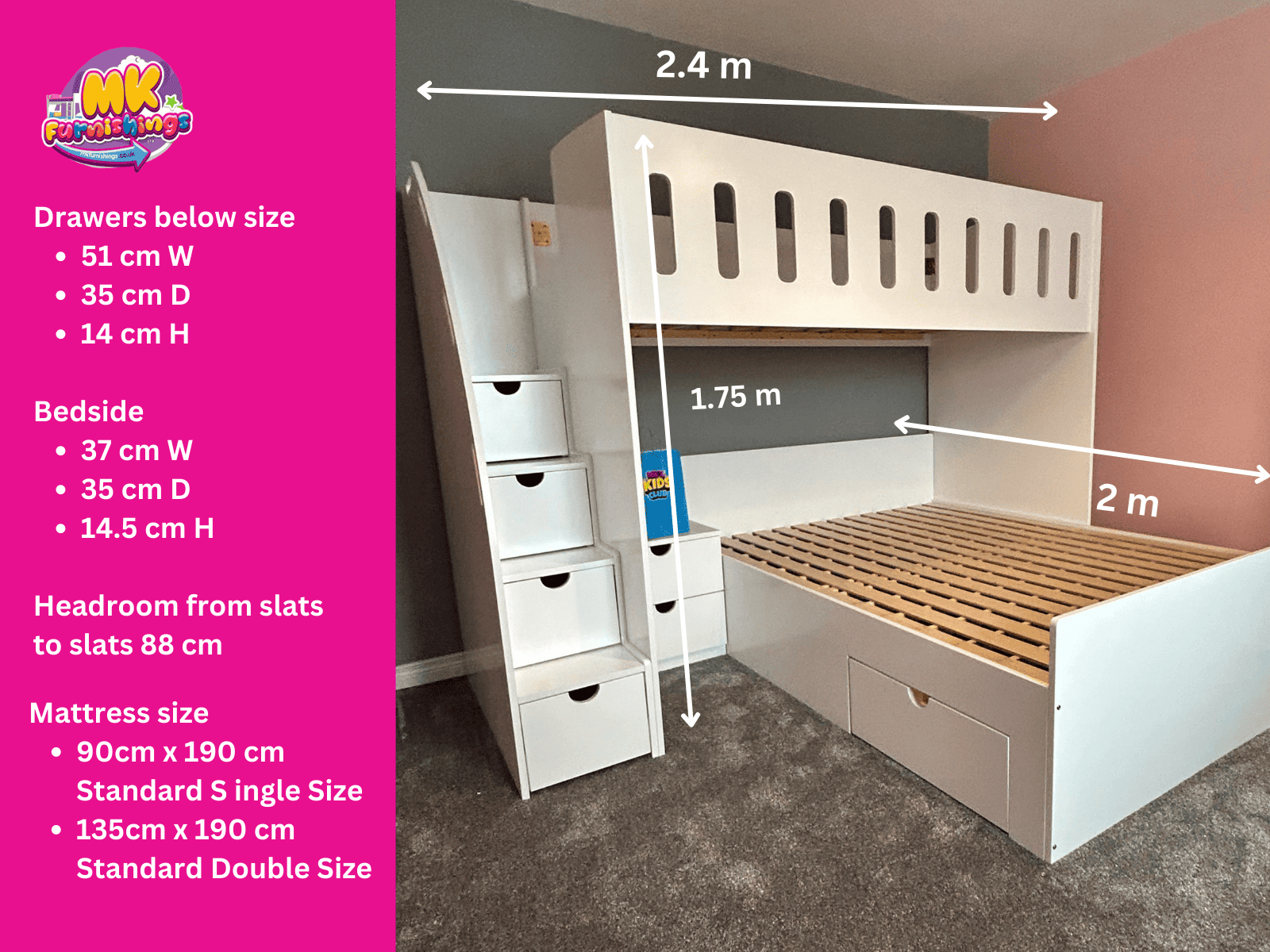 This bed offers versatile storage options including under-bed storage and staircase storage, making it easy to keep the room tidy and organised. The design is thoughtfully equipped to use every inch of available space effectively.