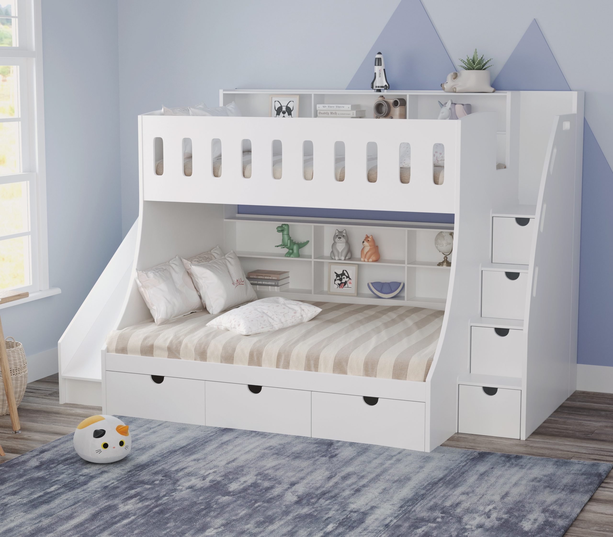 | Storage Options | Underbed drawers, built-in wall-mounted bookshelf below top bunk |