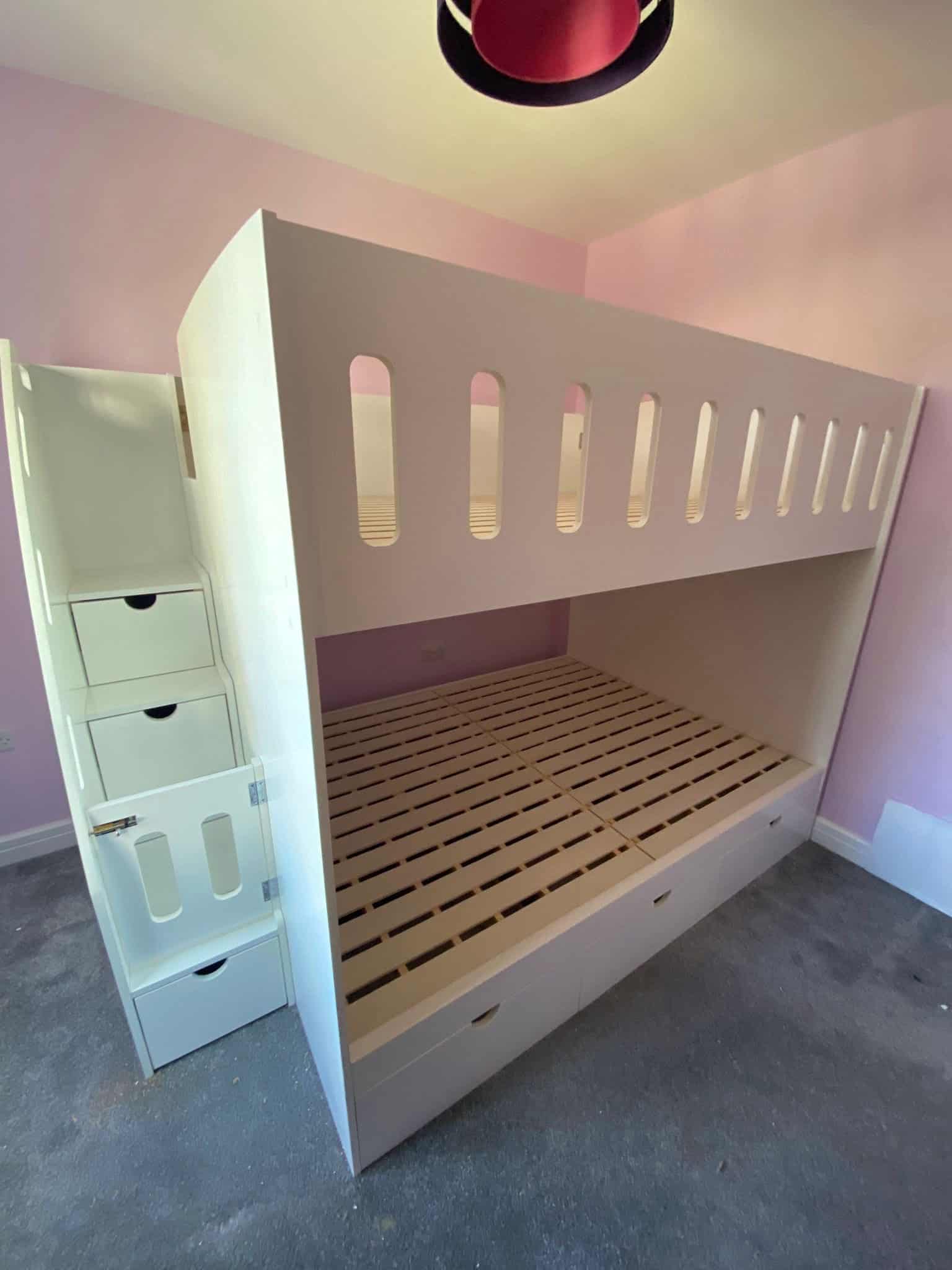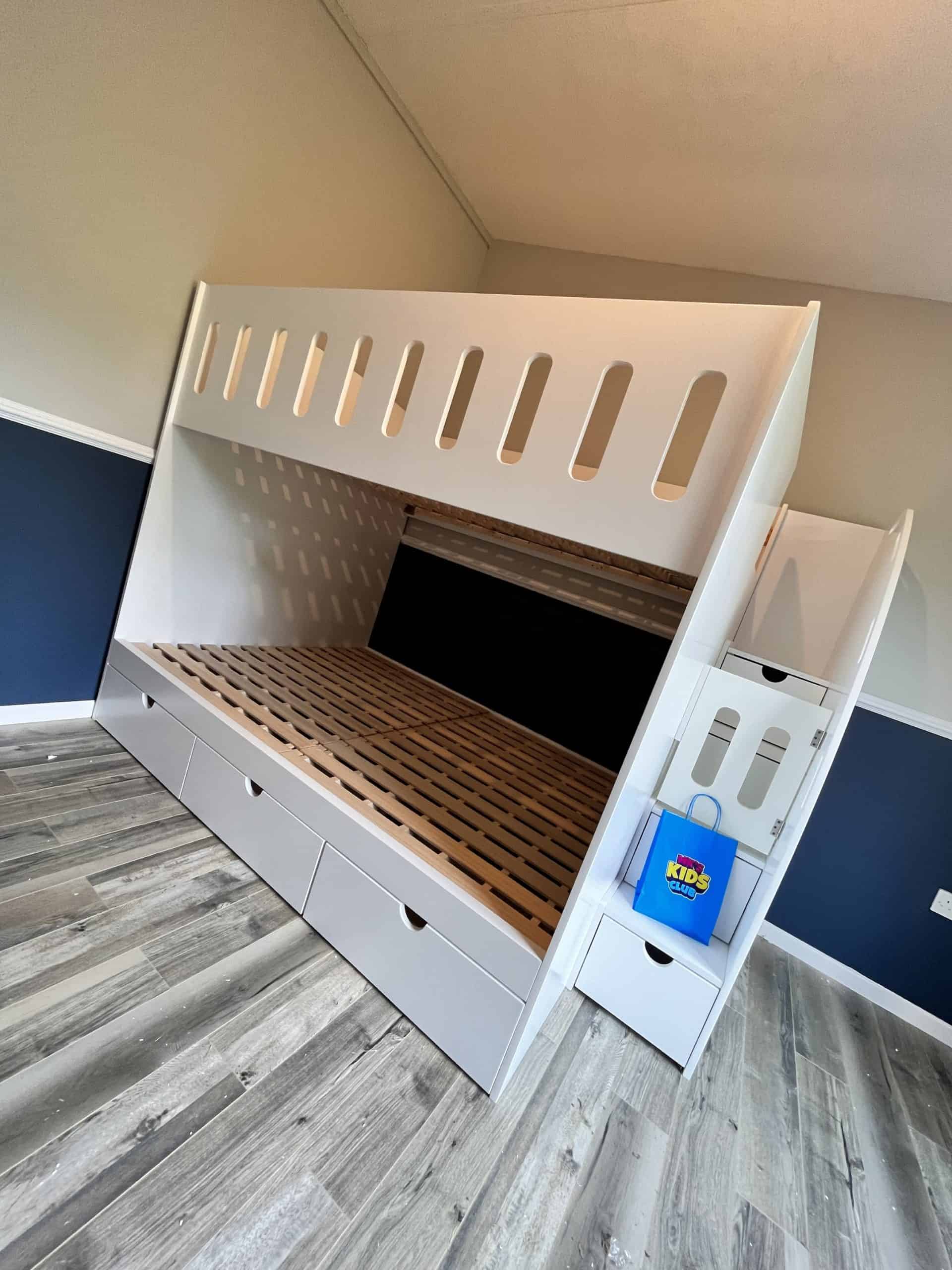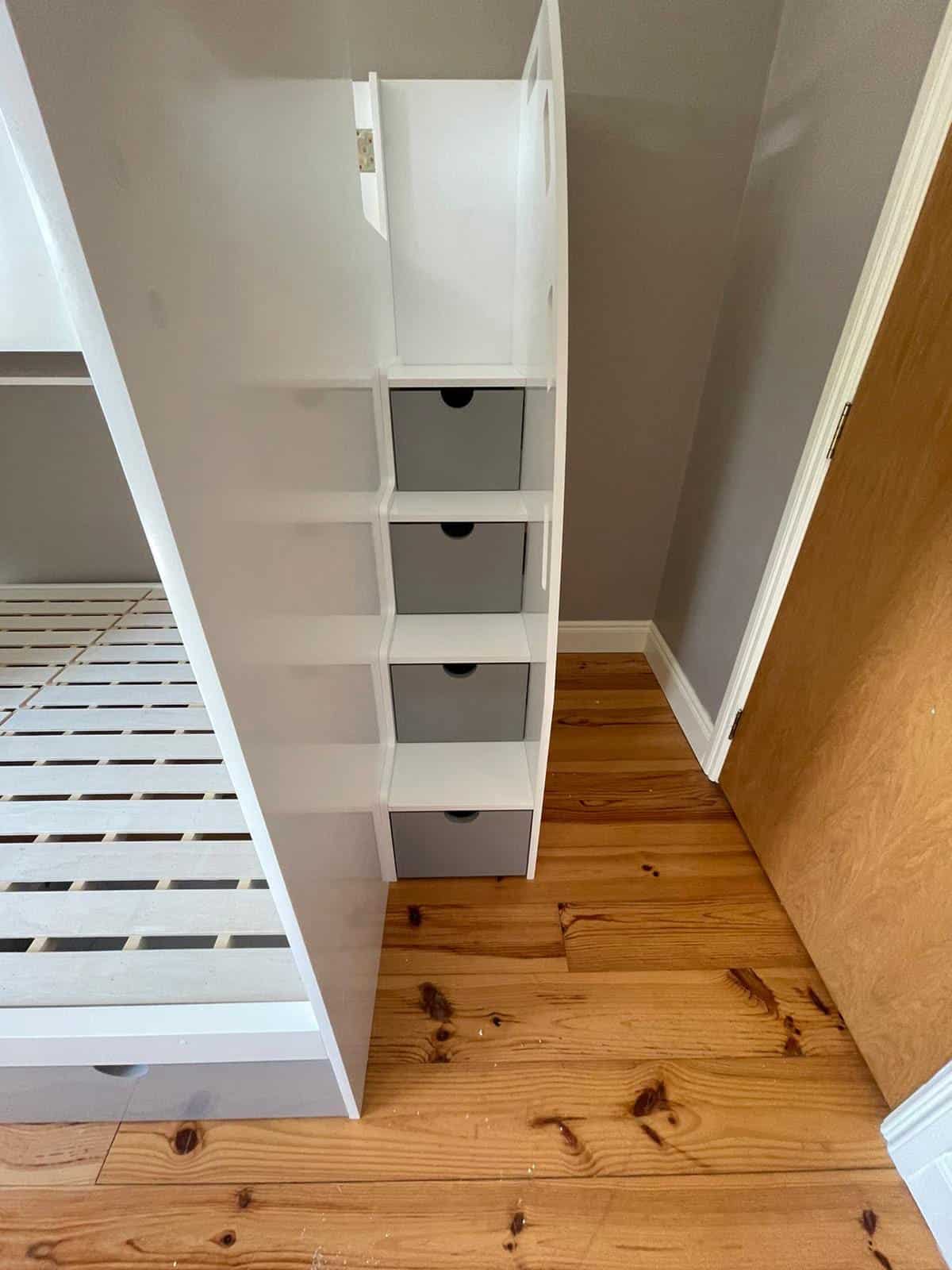 The double bunk bed is equipped with multiple storage options including staircase storage, underbed storage, and an optional long shelf, making it perfect for keeping children’s rooms tidy and organised.