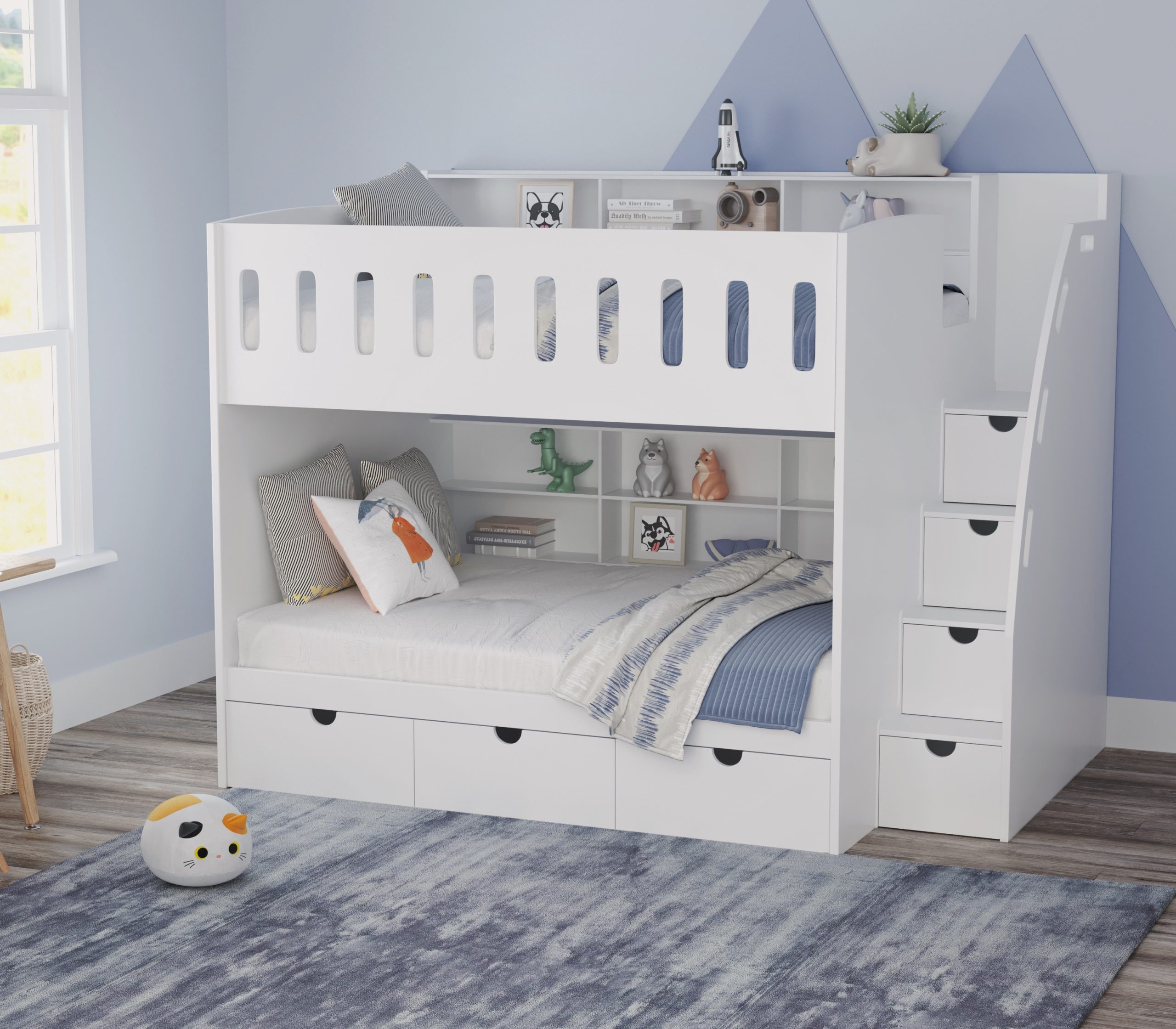 | Storage Options | Underbed drawers, built-in wall-mounted shelves integrated into bunk frame |