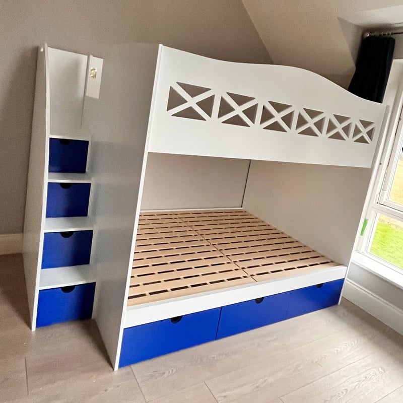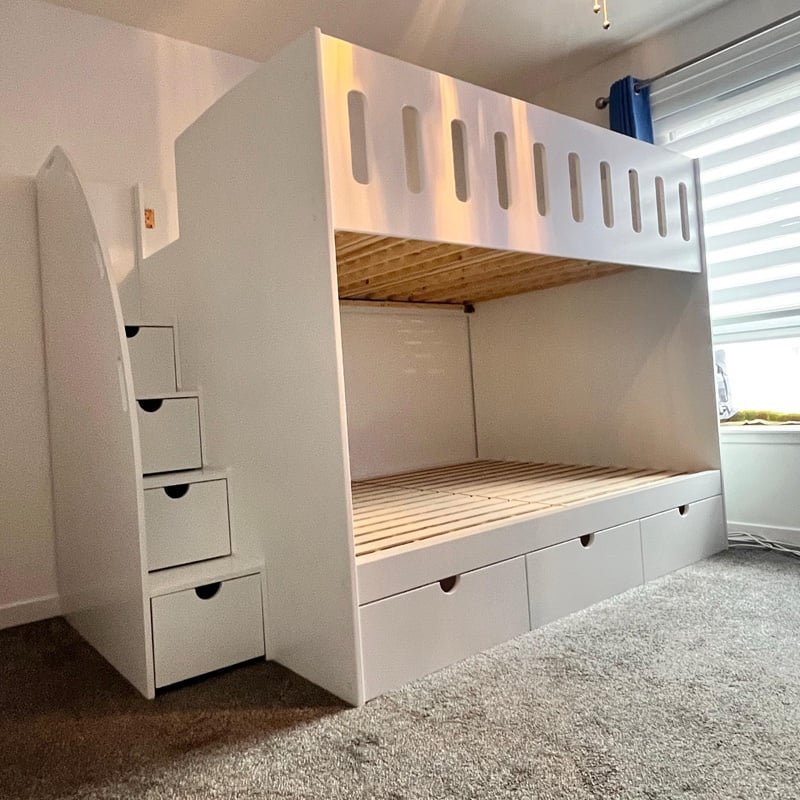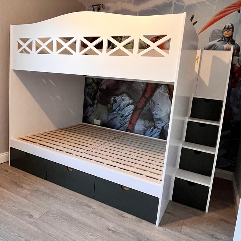 Our Double Bunk Bed is not just about saving space; it also features ample storage options. Available under-bed storage and staircase compartments allow for easy organisation of toys and bedding, while an optional long shelf offers additional space for books and decorations.