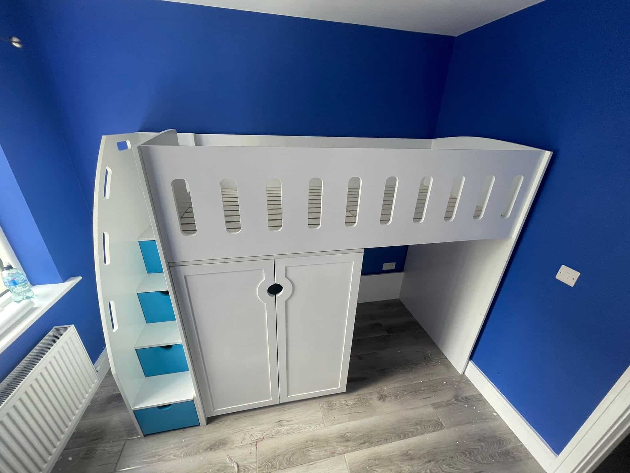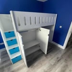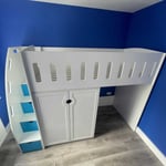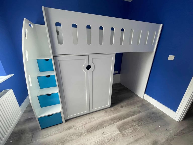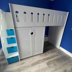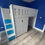 Sized at 240 cm wide, 175 cm high, and 140 cm deep, it’s perfect for compact bedrooms or multifunctional spaces. Shop now for £995.00 with 0% APR Novuna finance from £99.50/month or Clearpay up to £1,000. Personalise your loft bed with wardrobe using our Build Your Own Bed tool and choose from vinyl name decals, drawer colours and carved features. Delivery available within 8 to 10 weeks.