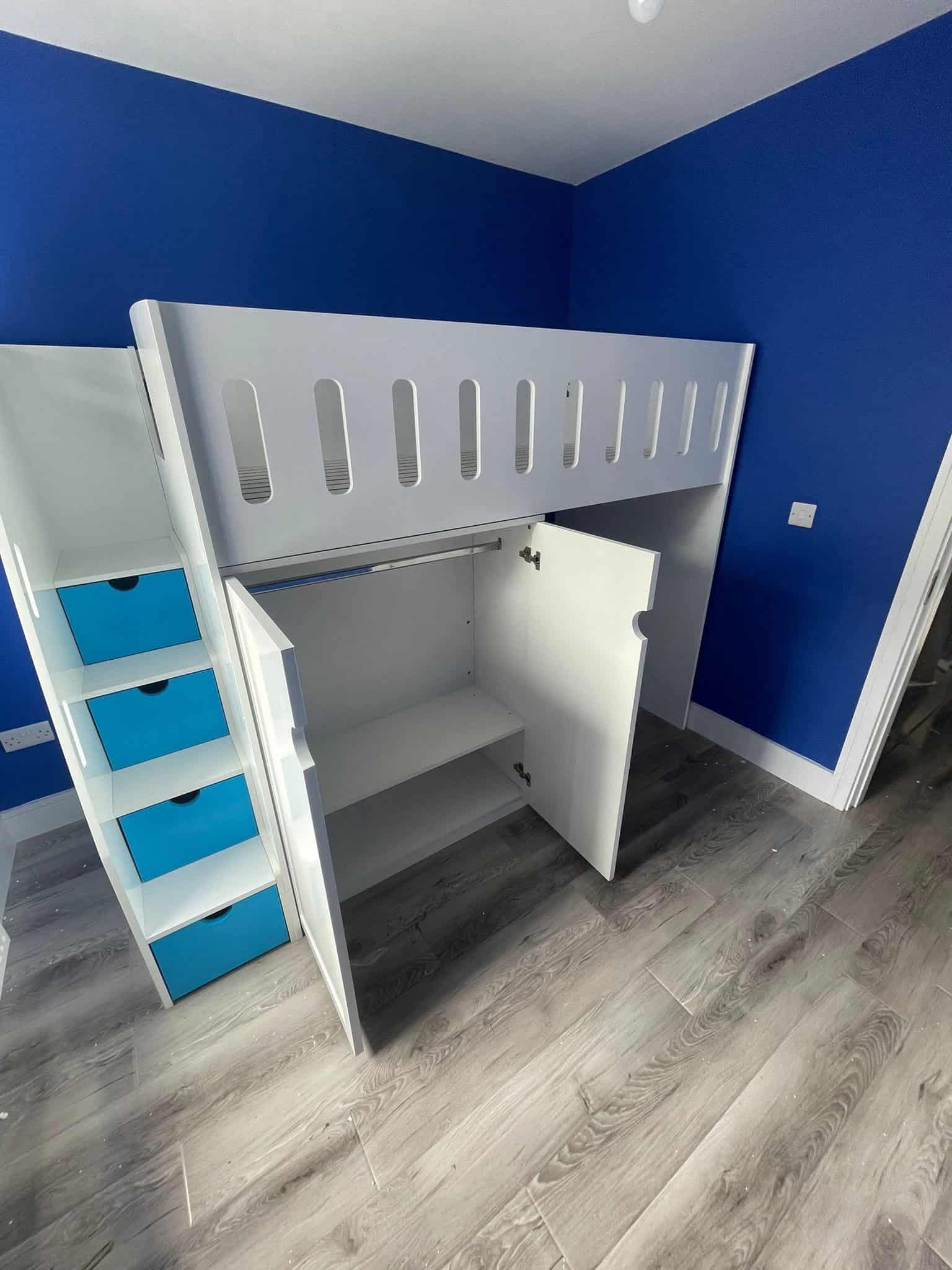 | Storage Options | Full-size wardrobe underneath top bunk, staircase storage |