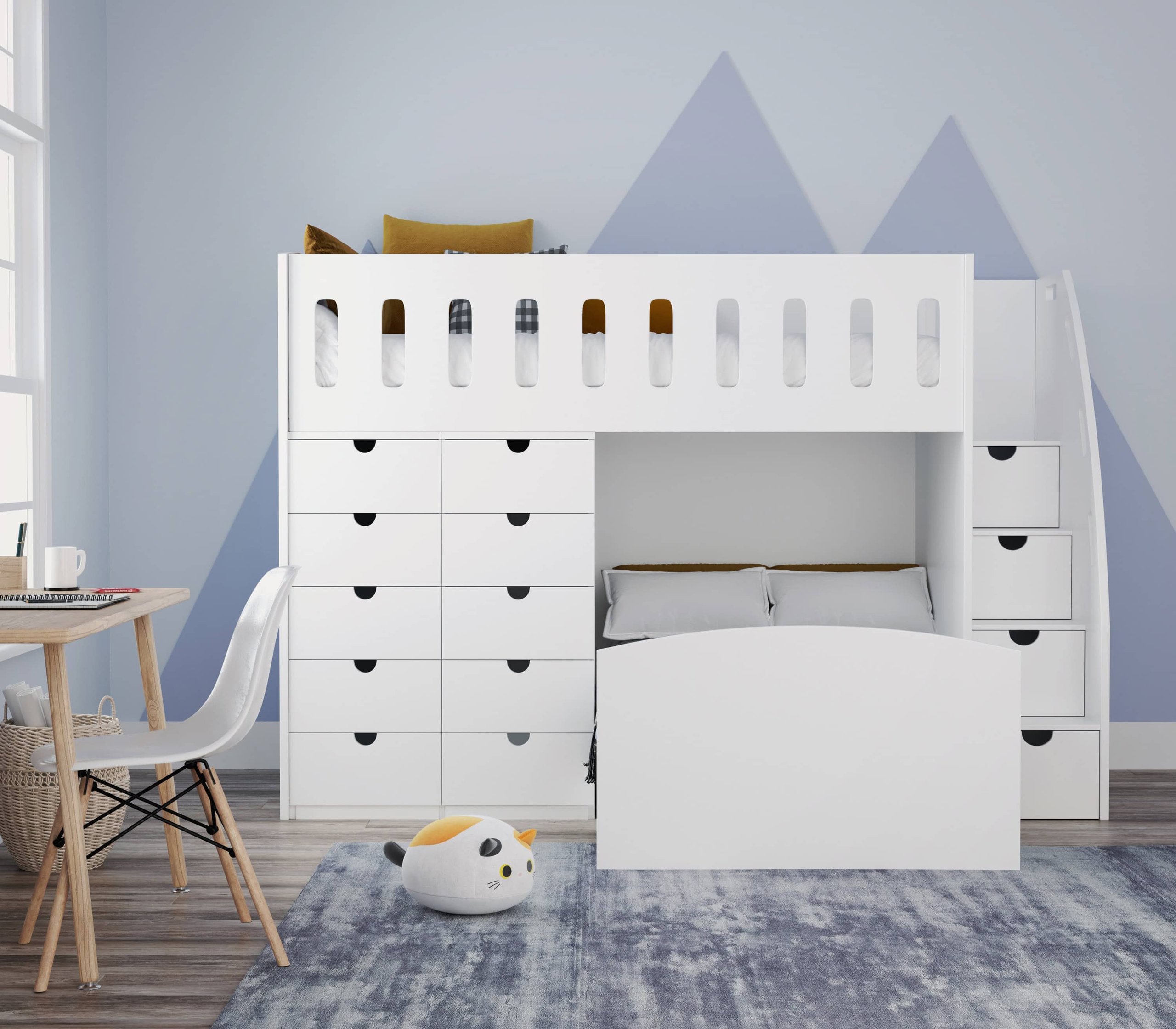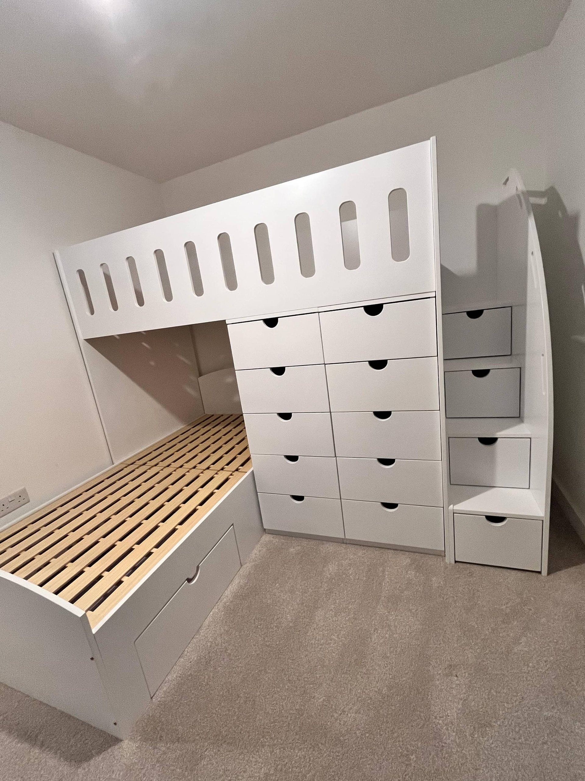 Maximise space while ensuring a safe and comfortable sleeping environment with our L-shaped bunk bed, featuring 14 integrated drawers. Ideal for creating a playful yet organised space in your child’s room, this bed offers ample storage and a compact footprint.