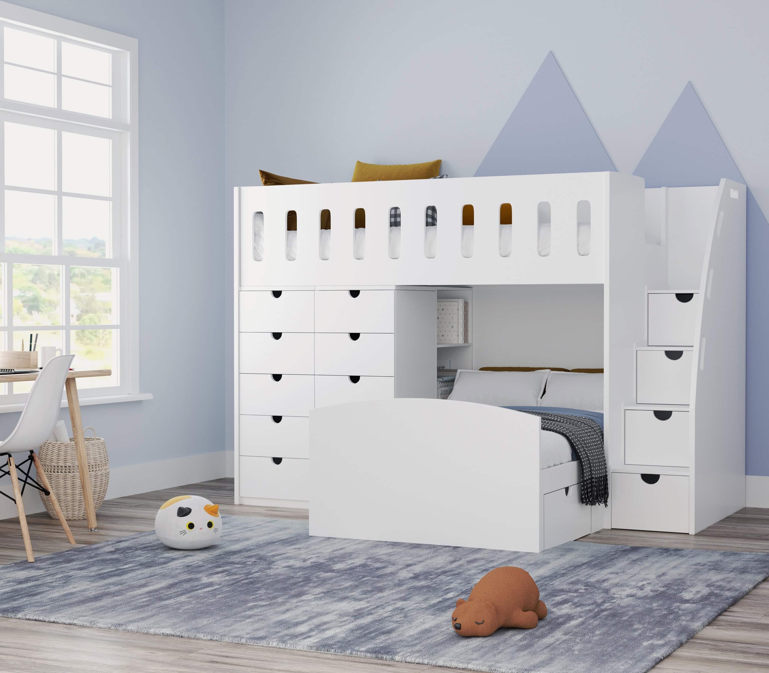 The bed features a twin-over-twin configuration with an L-shaped design that fits neatly into any corner, optimising floor space for play or study. It includes underbed storage and staircase storage, providing a place for everything from toys to clothing.