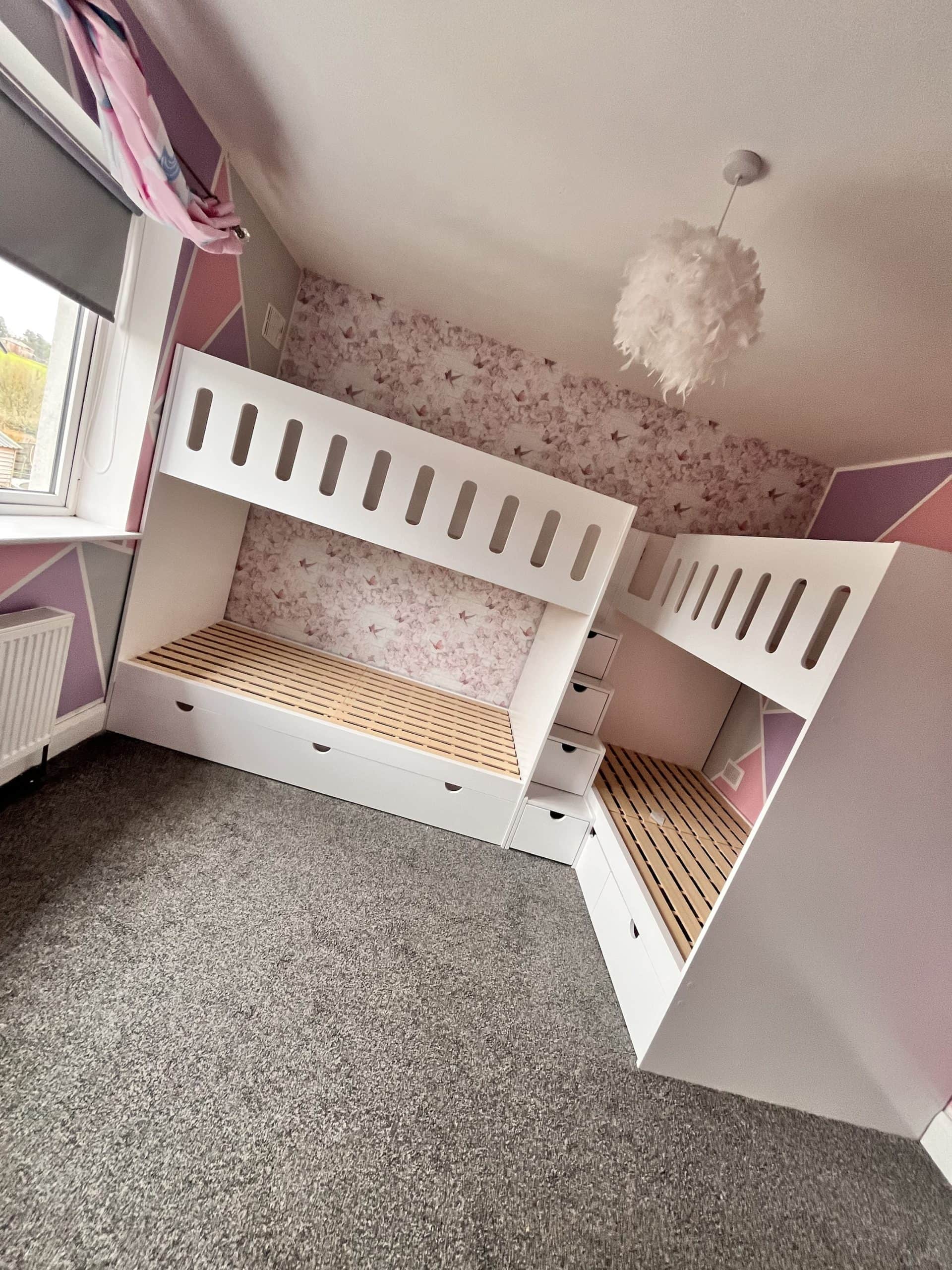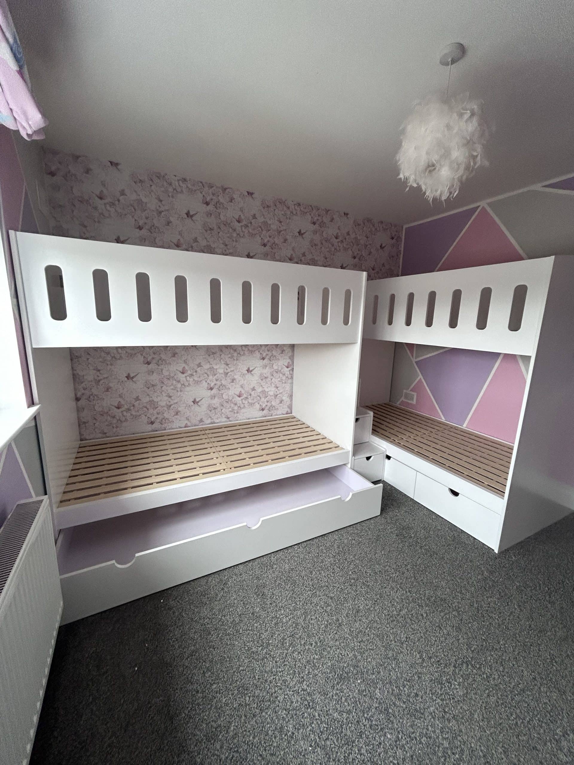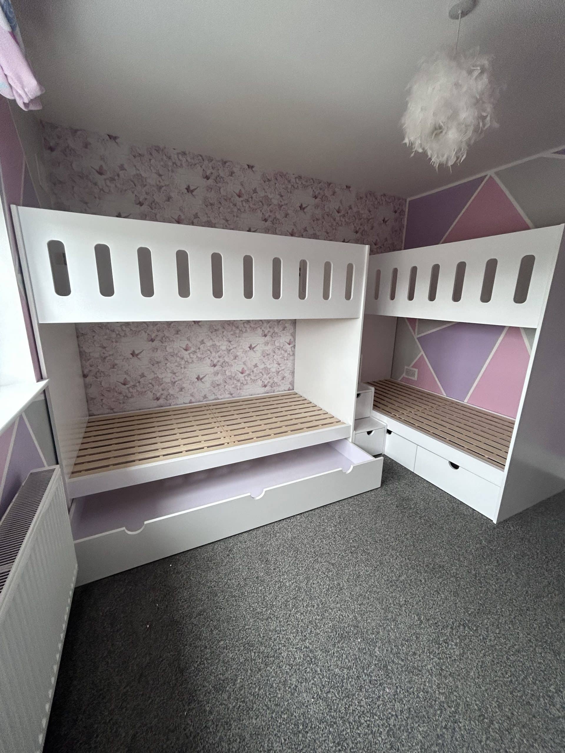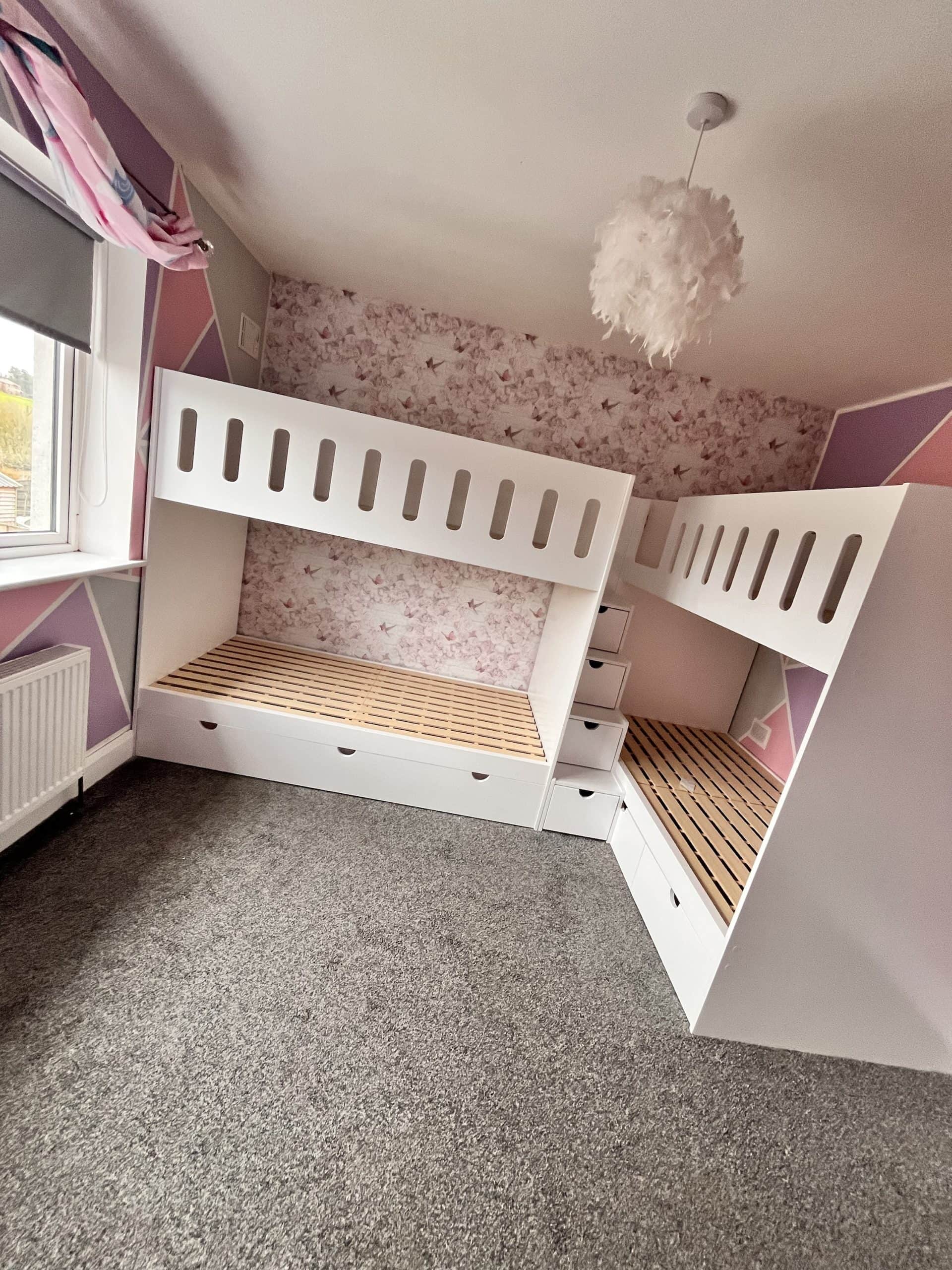 Shop the innovative L-Shaped Quad Bunk Bed from MK Furnishings UK, expertly designed to maximise space while ensuring a safe, comfortable, and playful environment for children. Ideal for rooms where space is at a premium, this bed accommodates four, making it perfect for sleepovers or siblings.