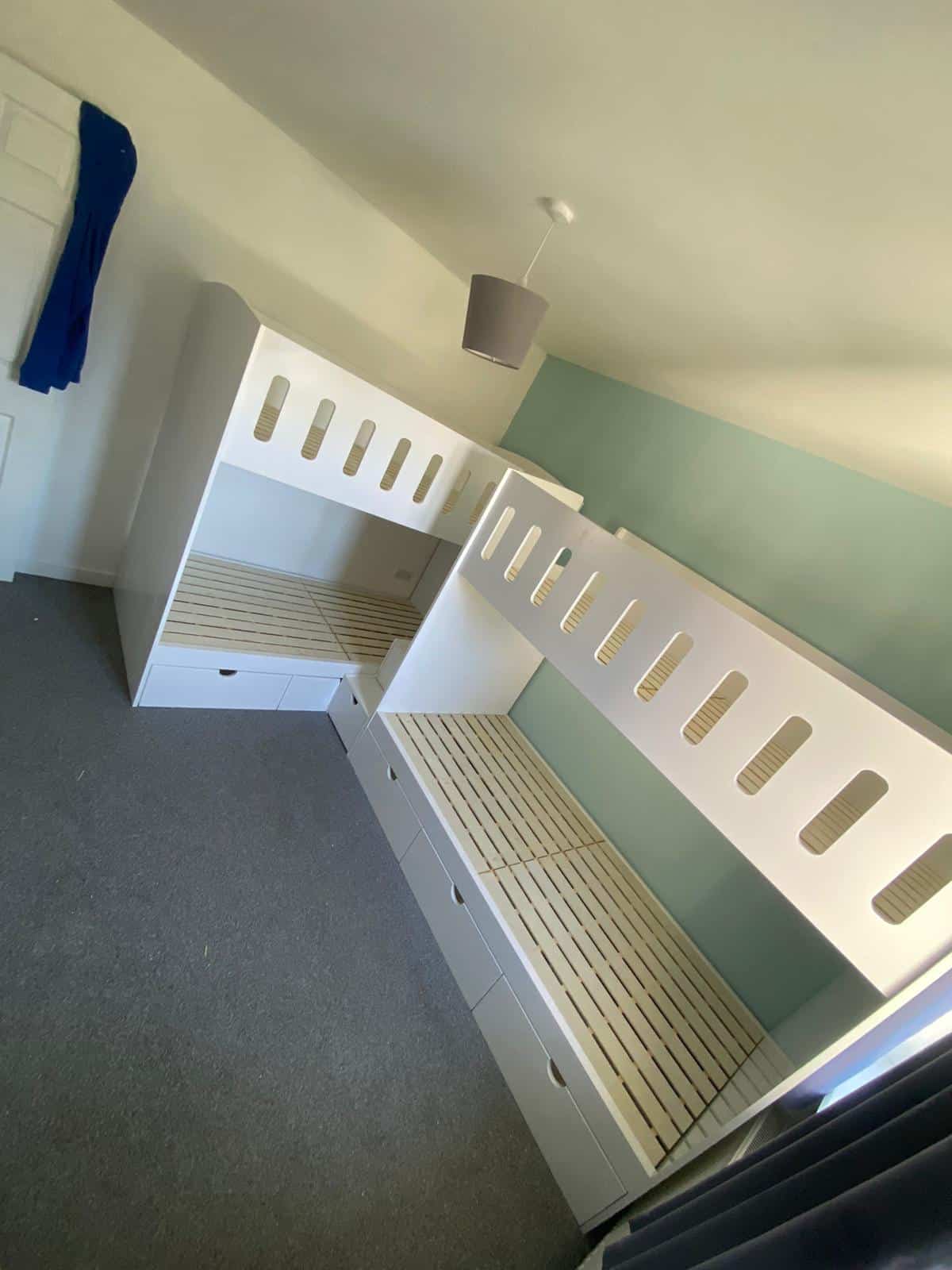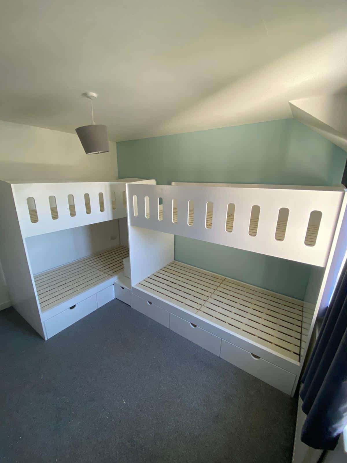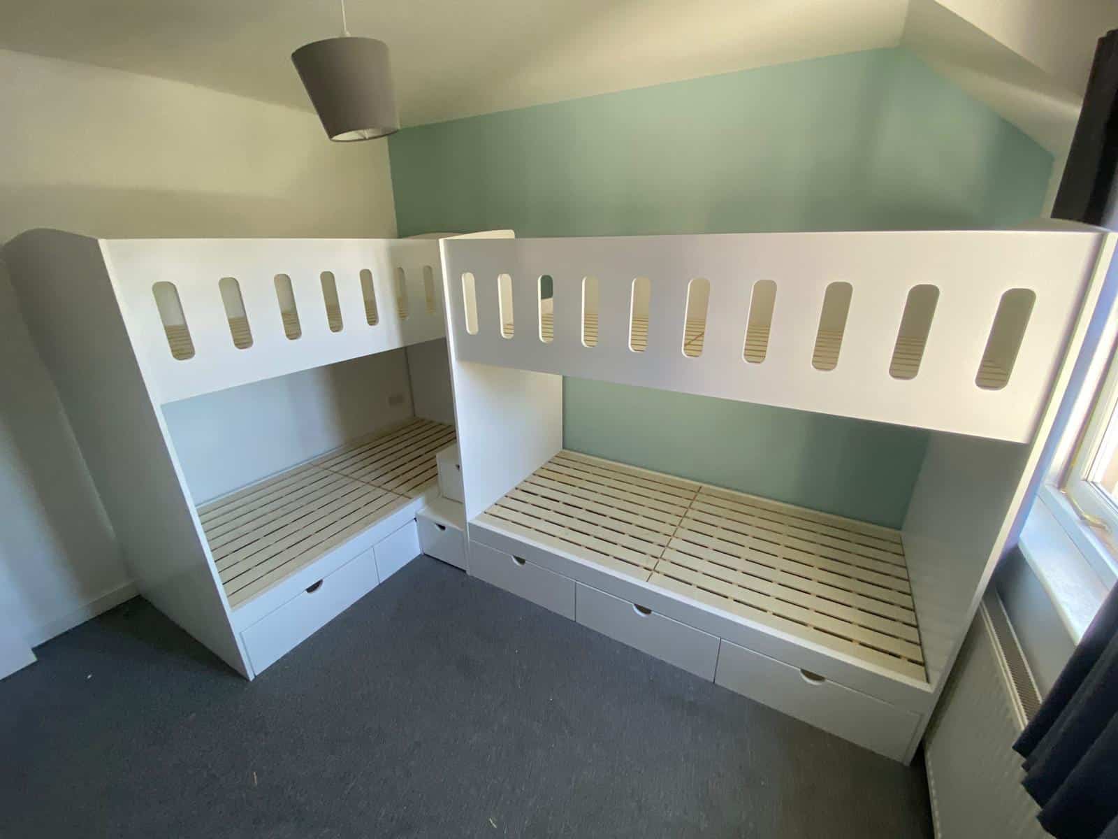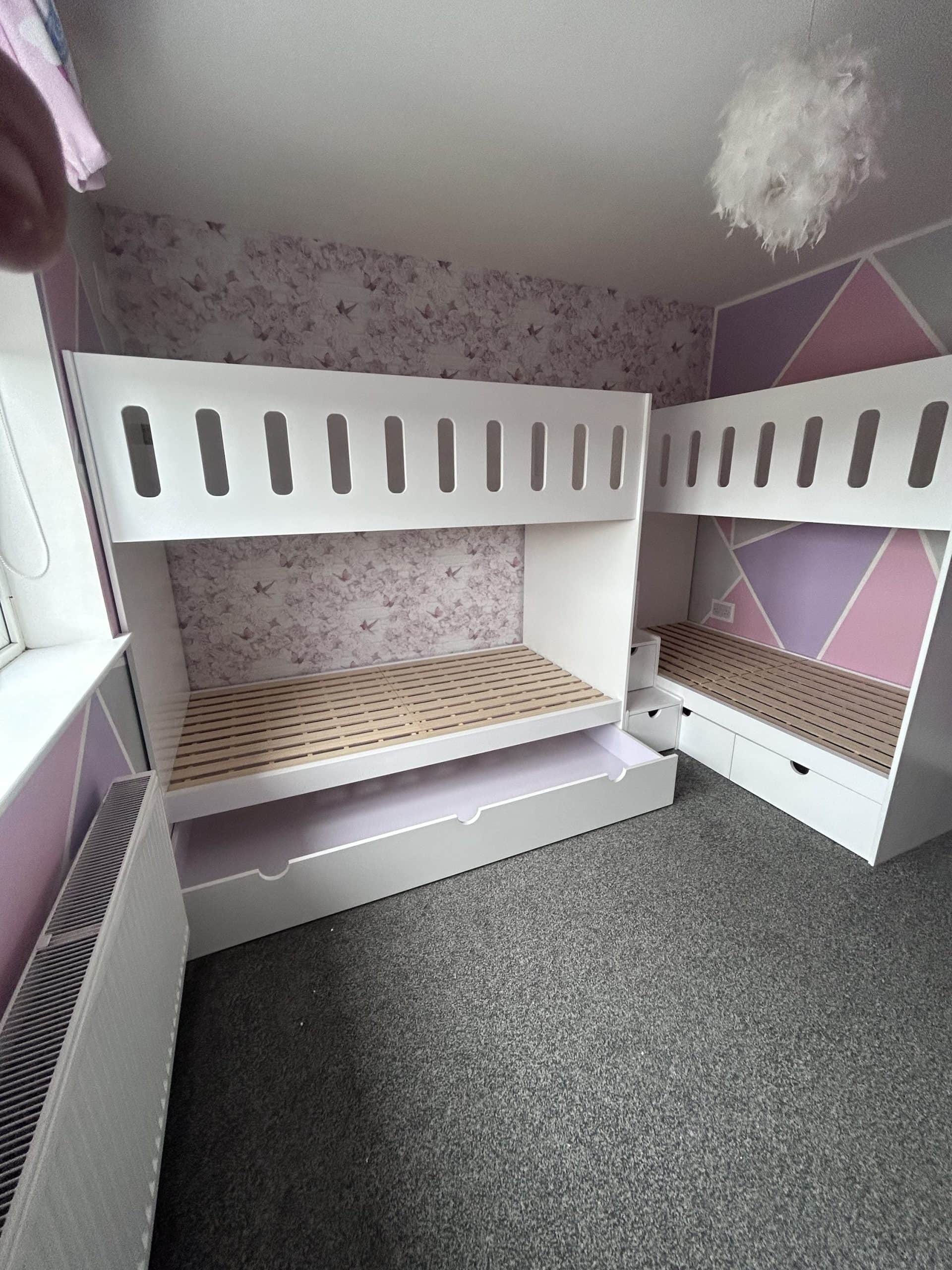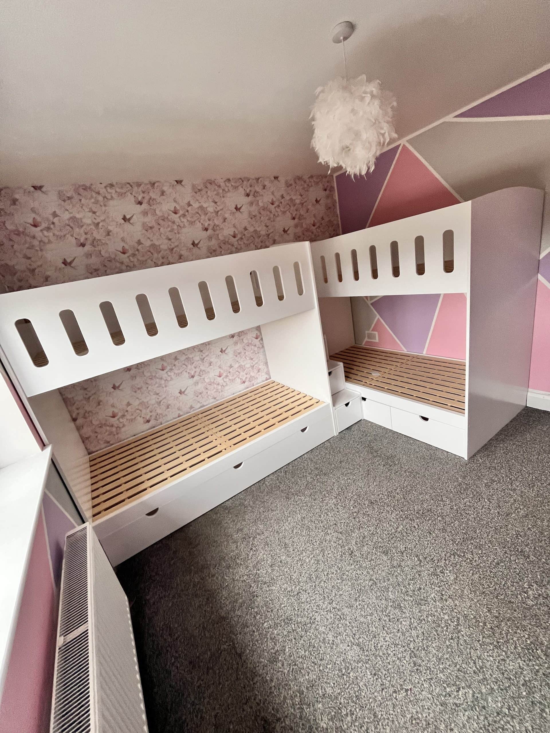 Shop the innovative L-Shaped Quad Bunk Bed from MK Furnishings UK, expertly designed to maximise space while ensuring a safe, comfortable, and playful environment for children. Ideal for rooms where space is at a premium, this bed accommodates four, making it perfect for sleepovers or siblings.