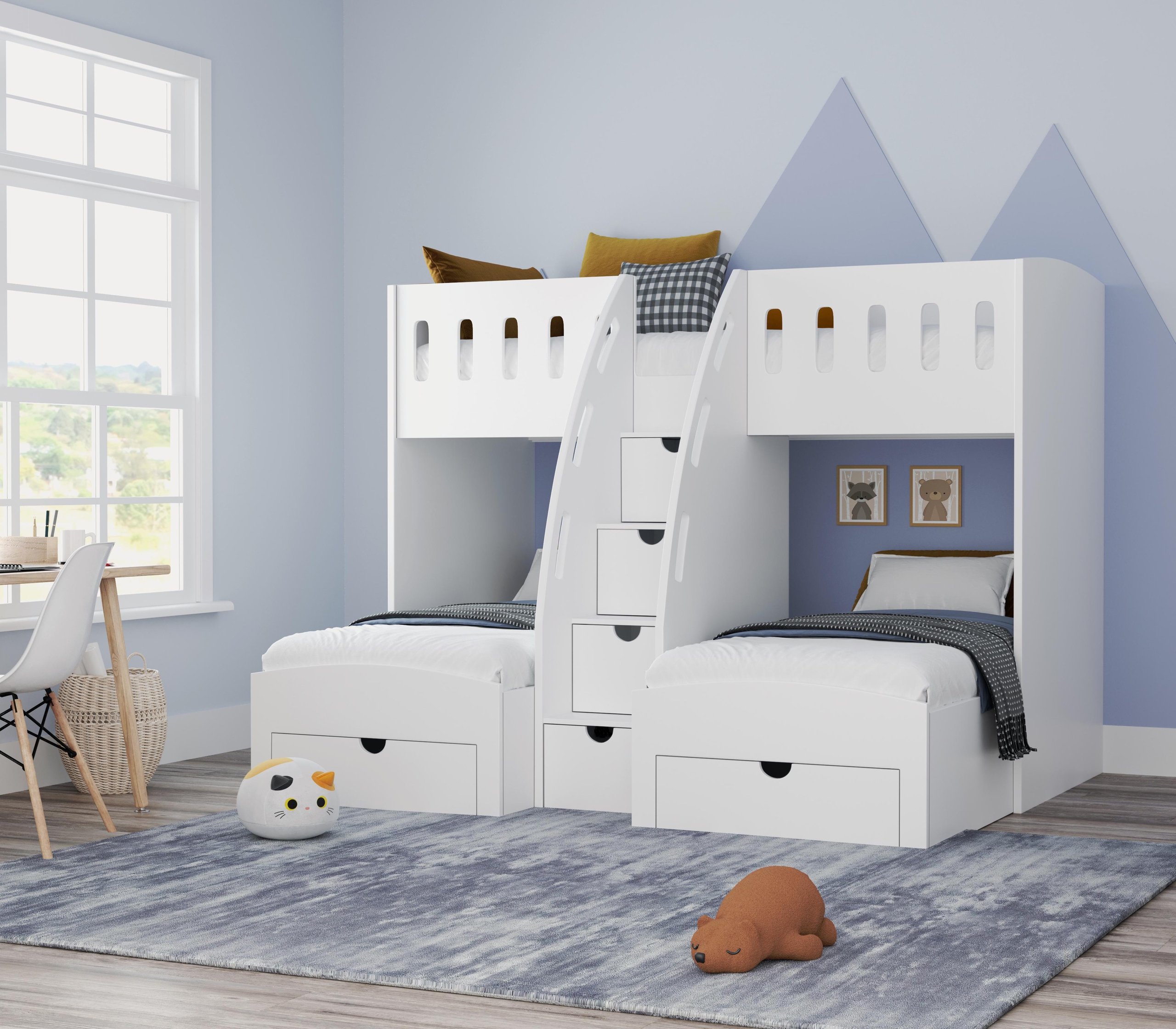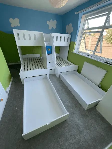 The M Shaped Triple Bunk Bed features ample storage options integrated within the staircase and under-bed drawers, ensuring toys, books, and other essentials are neatly tucked away. On-Request storage options bookshelves and/or toy boxes enhance the functionality, keeping the room organized and spacious.