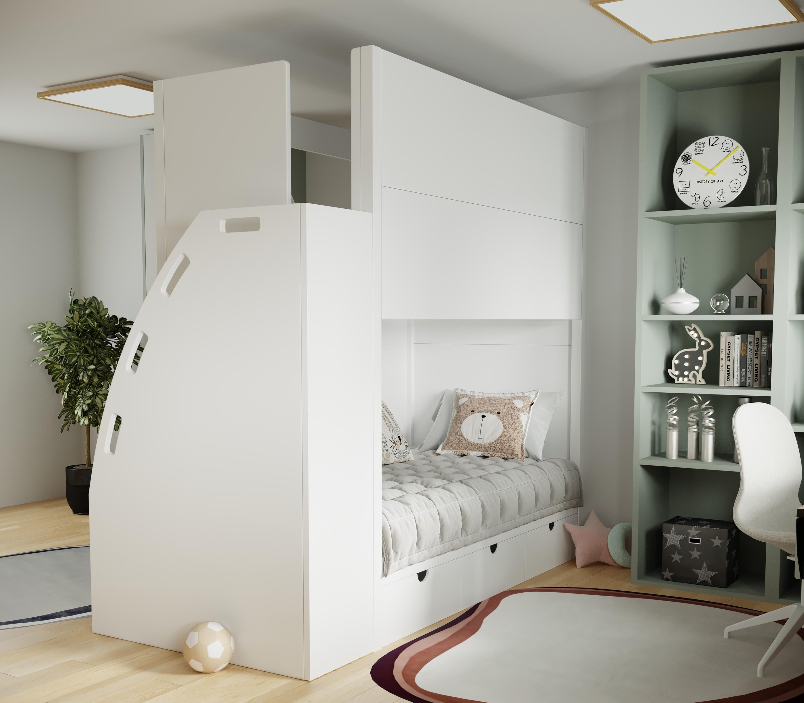 Buy the Room Divider Bunk Bed in the UK with MK Furnishing, a space-saving solution that offers privacy for boy and girl sharing space and storage for shared bedrooms in family homes, dormitories and studio flats. This bunk bed room divider allows two people to sleep comfortably while helping to split the room, making it ideal for siblings or roommates needing their own space. The room split bunk bed design features opposite-facing single beds that support semi-private sleep, with access via a safe staircase or optional slide. Built using moisture-resistant HDF, pine beams and poplar slats, the bunk bed room divider frame meets the BS EN 747 safety standard. Smart underbed drawers and stair-integrated storage deliver a true clever storage solution, and the gender-neutral finish broadens its appeal. Priced at £1145.99, this room divider bunk bed combines functionality, safety and style. Customise your setup with name decals, drawer colour themes and carved cut-out options. Finance available with buy now, pay later through Klarna (0% APR) or Clearpay for totals up to £1000, split into six interest-free instalments. Backed by a 24-month warranty and delivered in 6 to 14 weeks, order today to create a more organised and peaceful shared space.