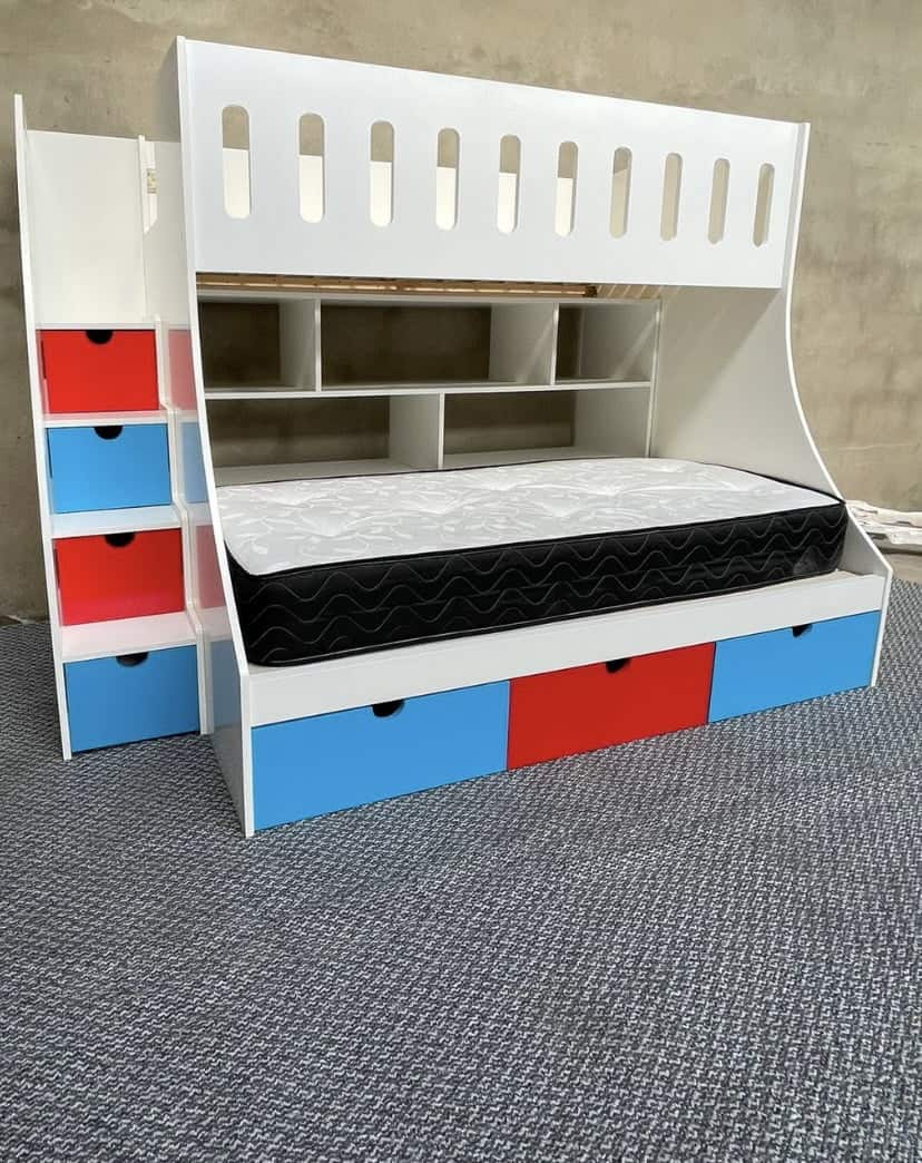 The bunk bed offers versatile under-bed storage and staircase drawers, providing ample space to store toys, books, and other essentials neatly. The option to add a long shelf further enhances the storage capabilities, ensuring everything your child needs is within easy reach.