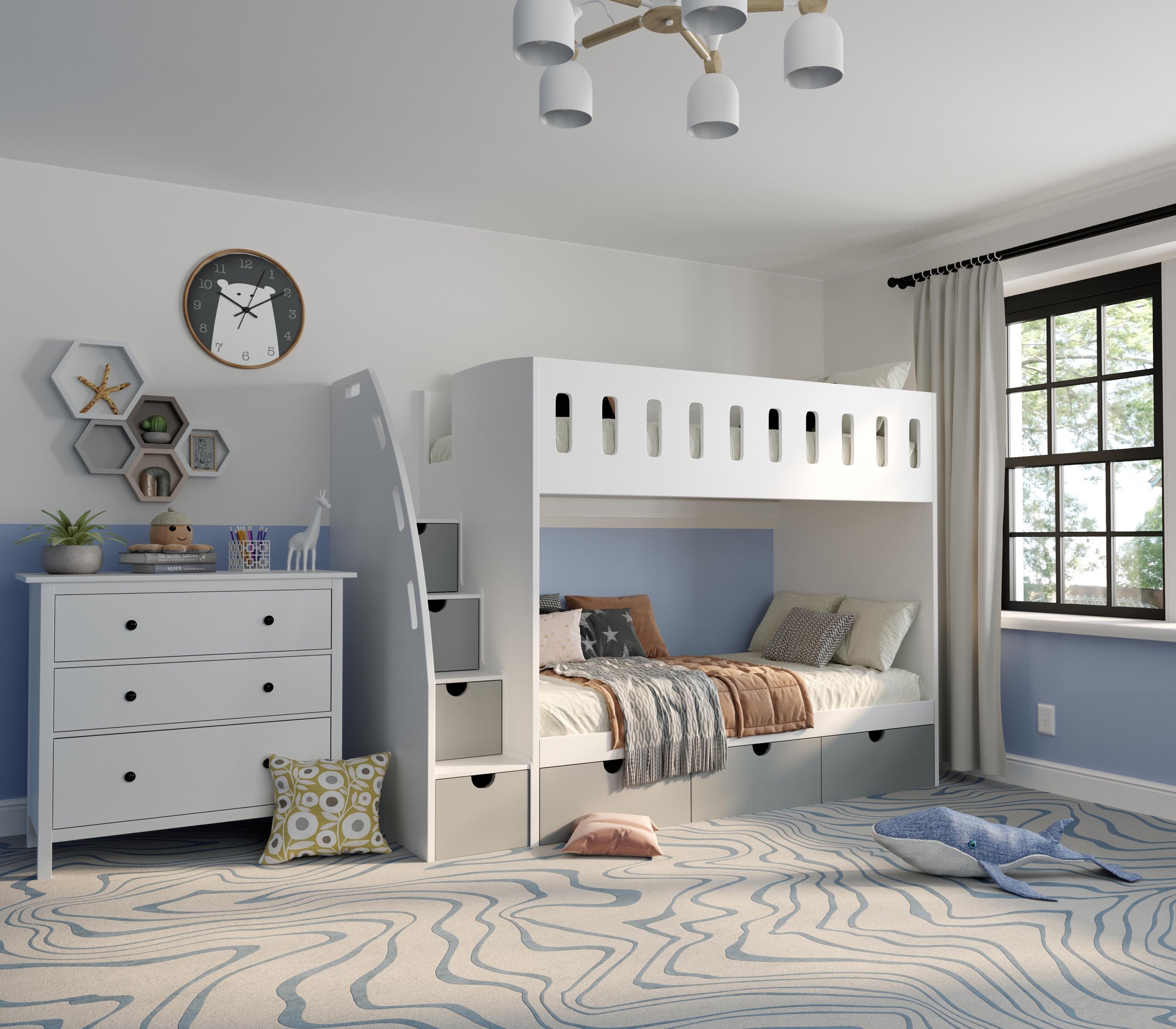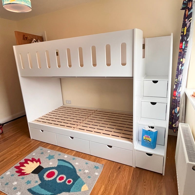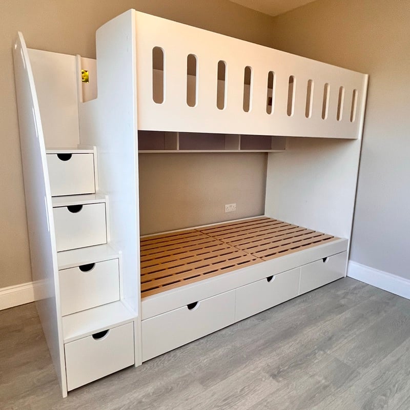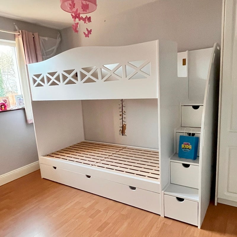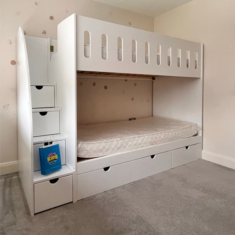 The Tall Bunk Bed With Stairs is not just a sleeping area but a clever storage solution as well. It comes equipped with staircase drawers, under-bed storage, and an optional long shelf, making it easy to keep your child’s room tidy and organised.