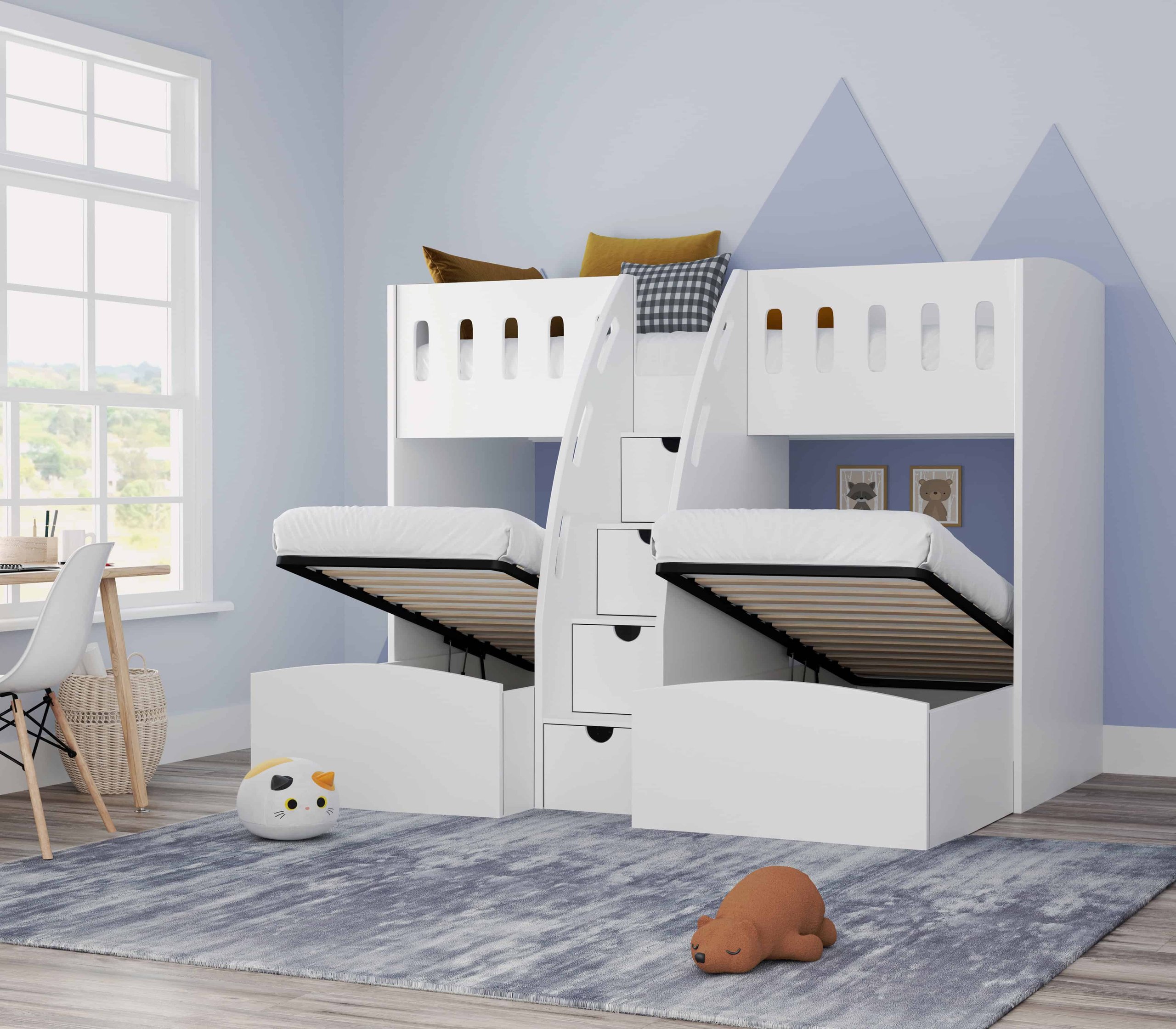 | Underbed Storage | Ottoman lift-up compartments in both lower beds; staircase drawers |